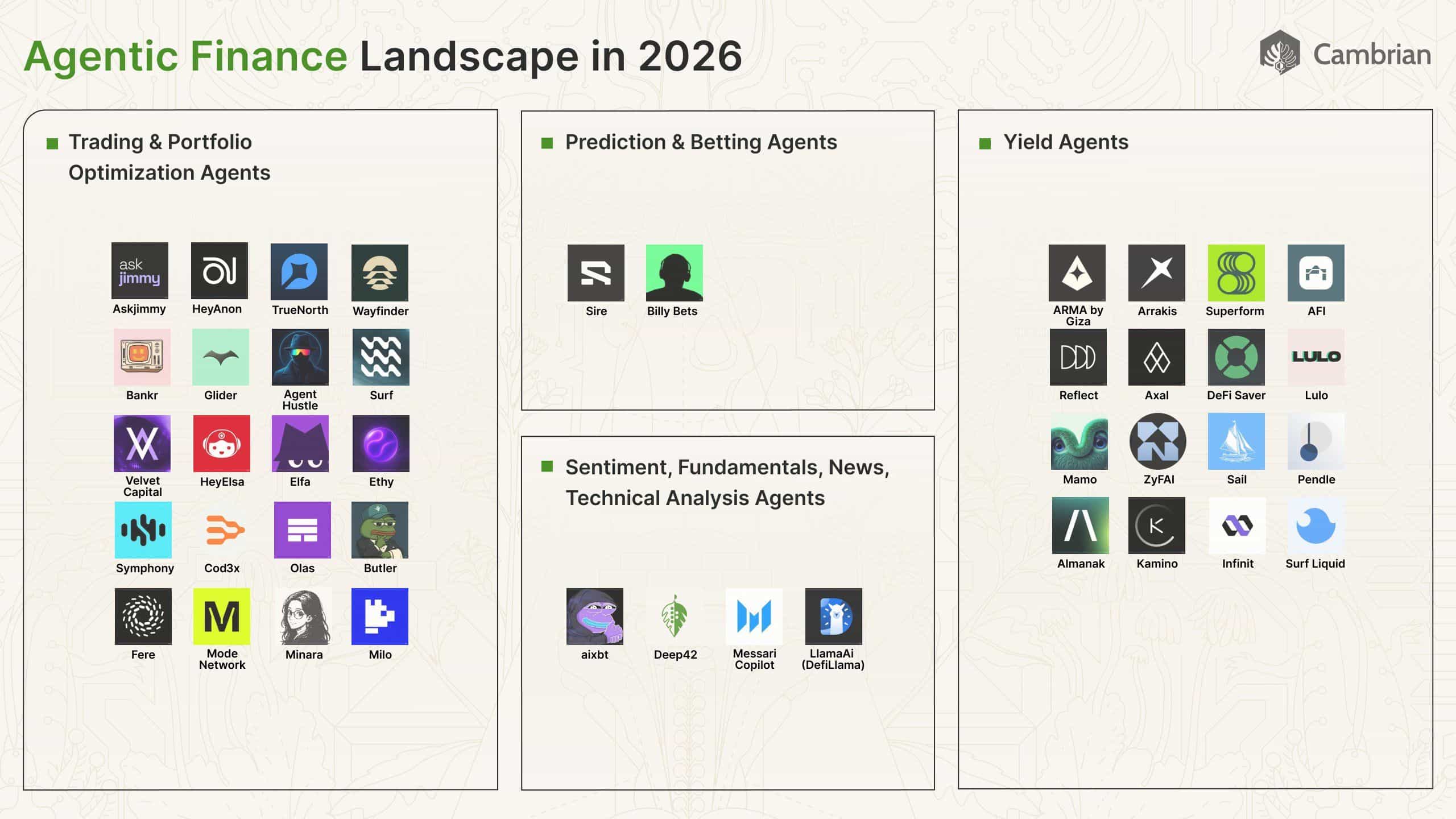 To understand the practical application of AgentFi for traders and institutions, we must analyze the specific actors building this ecosystem. According to the authoritative "Agentic Finance Landscape in 2026" mapped by Cambrian, the market has rapidly stratified into four distinct, highly specialized quadrants. These quadrants do not operate in isolation; they interact with each other to form a cohesive, autonomous financial network.