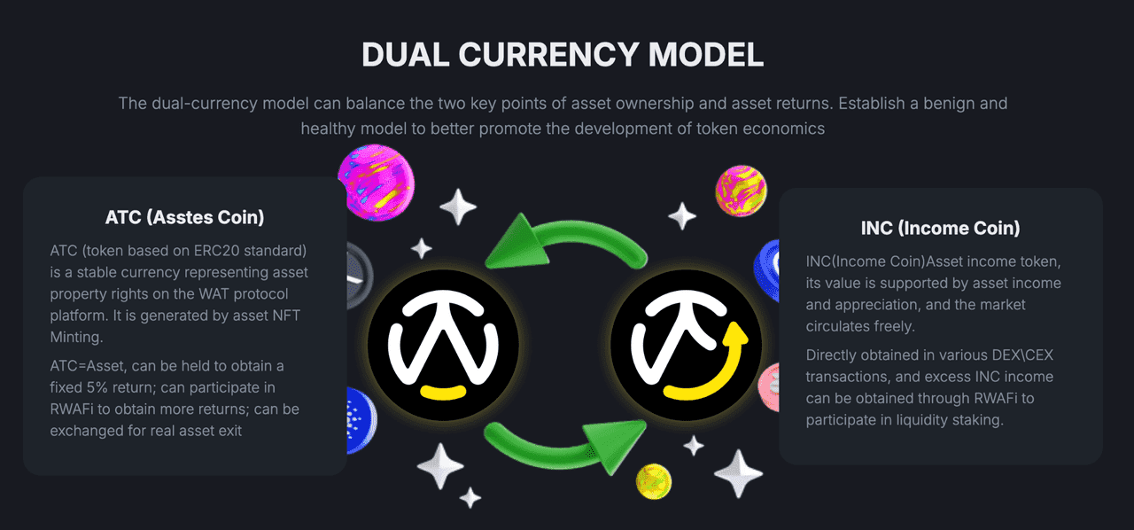 The ecosystem uses a dual-token model: ATC for asset ownership representation and INC for asset income and appreciation exposure.