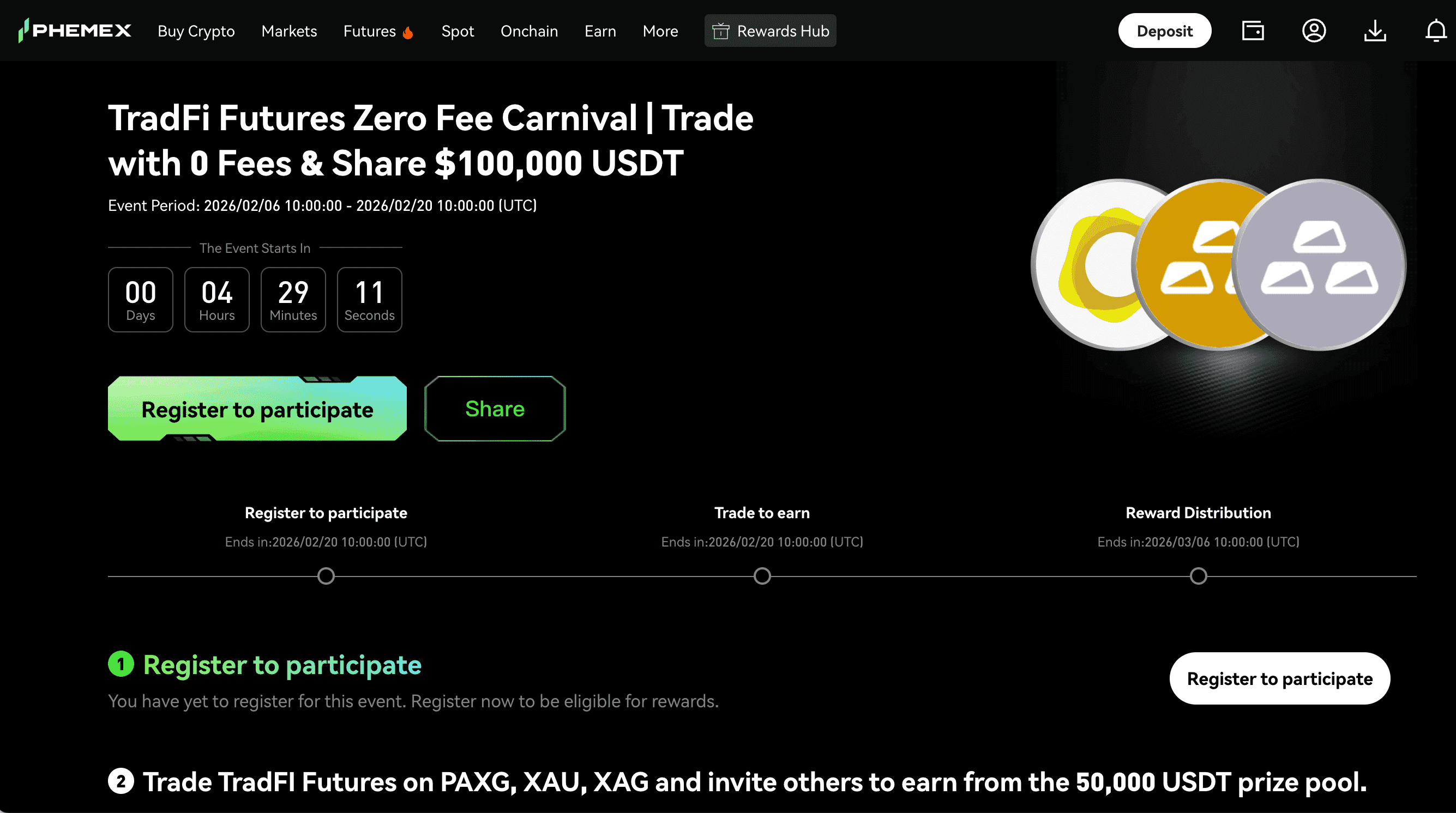 Log in to Phemex and navigate to the TradFi Futures Zero Fee Carnival landing page.