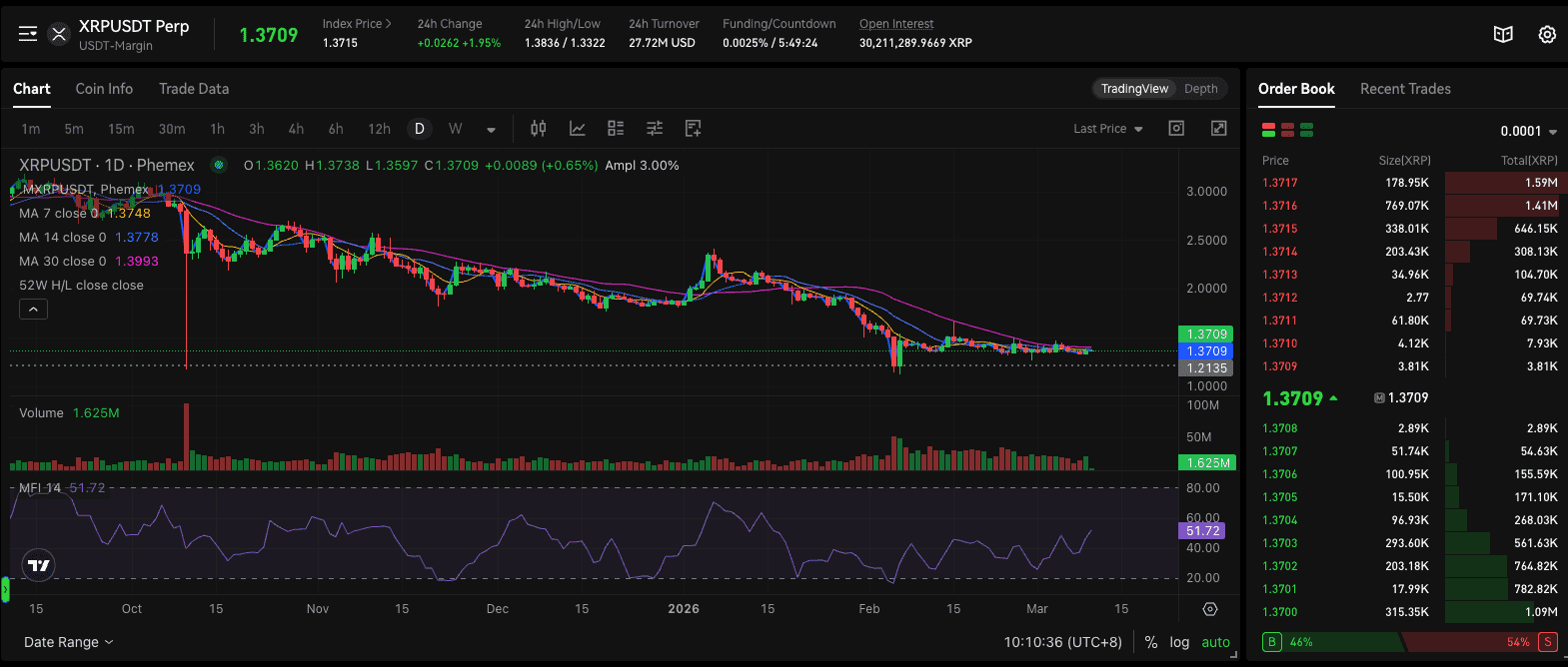 Trotz auffälliger On-Chain-Abflüsse verharrt der XRP-Kurs weiterhin in einer engen Handelsspanne. Nach aktuellen Phemex-Daten vom 10. März 2026 wird der XRPUSDT Perpetual Contract (USDT-Margin) bei rund 1,3709 USD gehandelt.