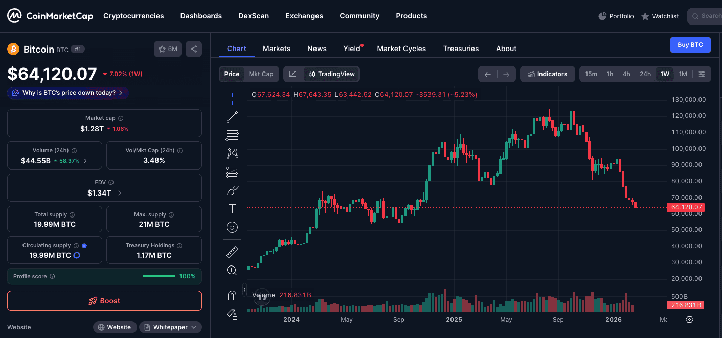 El precio de Bitcoin hoy se sitúa en $64,120.07, intentando mantener soporte tras un descenso del 7,02% en la última semana.