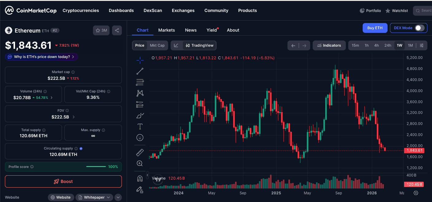 El gráfico en vivo de Ethereum muestra actualmente un precio de $1,843.61, marcando una corrección del 7,92% en siete días.