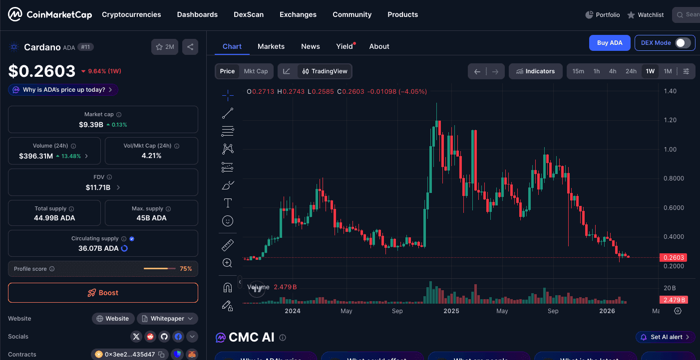 Factores de resiliencia: A pesar de la caída semanal del 9,64%, la capitalización de ADA se mantiene estable en $9,39B. El activo se encuentra en una "zona de valor" para tenedores de largo plazo, interactuando con soportes no vistos desde el ciclo anterior.