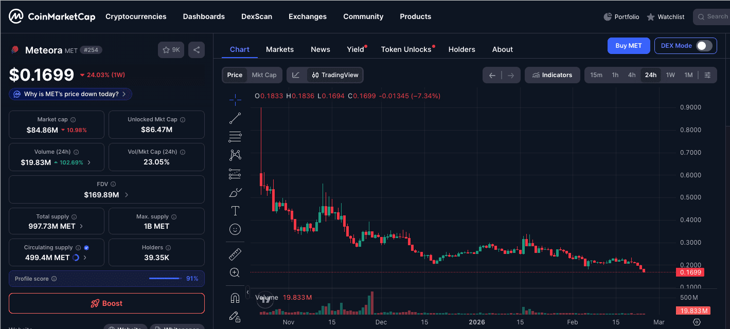 El mercado de criptomonedas atraviesa actualmente un periodo de intensa observación. Al momento de redactar este informe, Meteora (MET) cotiza a $0.1699, lo que representa una caída del 24.03% en la última semana. Es relevante señalar que el volumen de operaciones en 24 horas ha aumentado más de un 102%, alcanzando $19.83M, lo que sugiere una fuerte presión vendedora y movimiento acelerado de capital mientras el mercado reacciona a informes externos próximos.