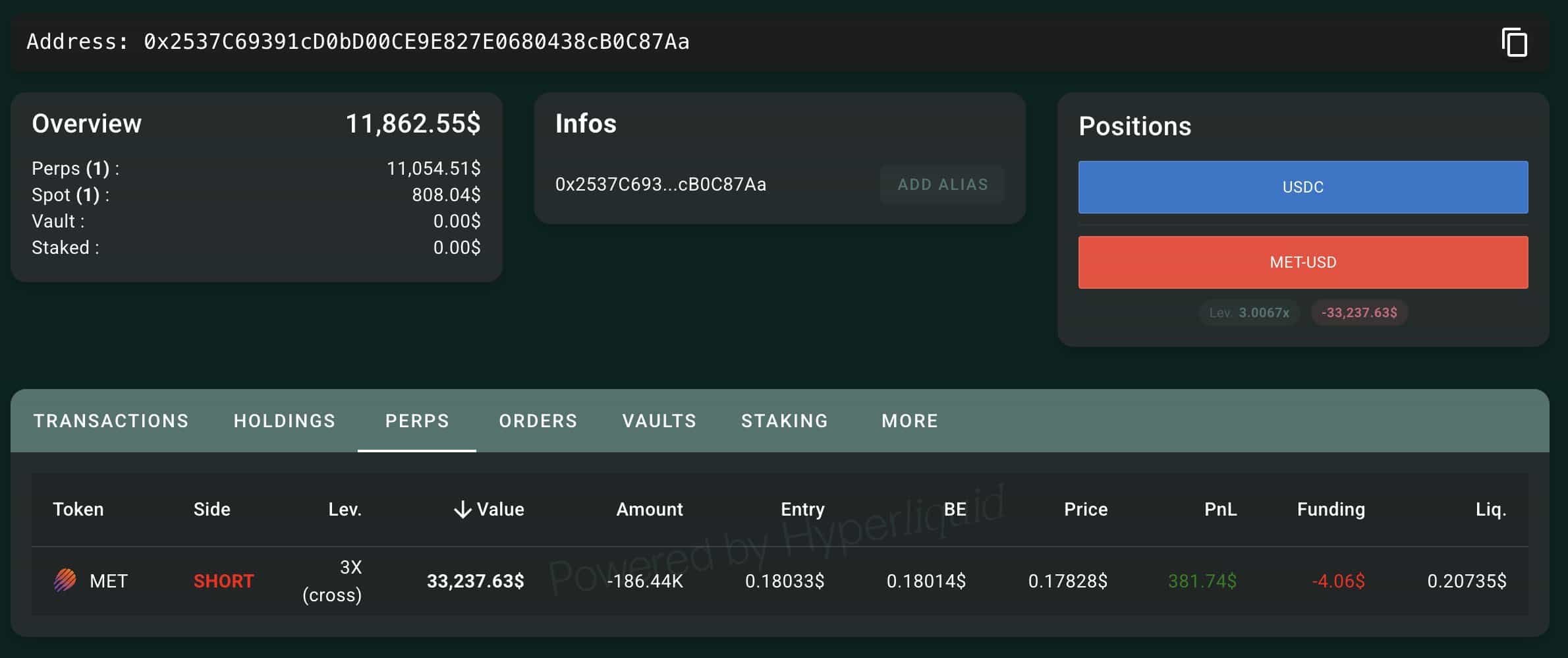 La Posición Perpetua: Simultáneamente, la misma entidad utilizó un exchange descentralizado para abrir una posición corta 3x en MET, por aproximadamente 186,435 MET.