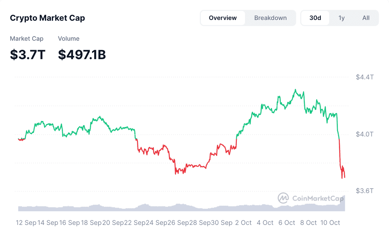Desplome de Bitcoin: Tras marcar un máximo en torno a los $126,000 el 7 de octubre, Bitcoin (BTC) cayó casi un 10% intradía el 10 de octubre, llegando fugazmente por debajo de $108,000. Para la mañana del viernes recuperó terreno y oscilaba entre $112k–$121k.