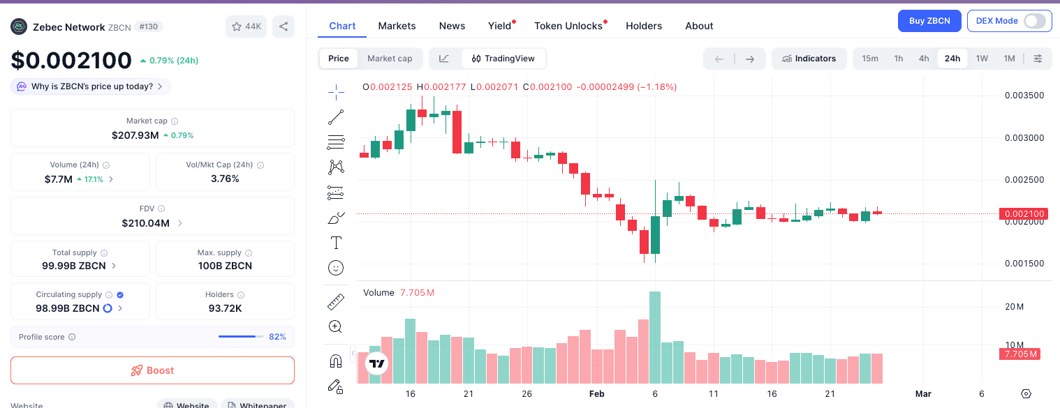 A finales de febrero de 2026, ZBCN mantiene una capitalización de mercado aproximada de 207,93 millones de dólares. El token actúa como activo nativo de utilidad y gobernanza de la red. Su suministro está limitado a un máximo de 100 mil millones de tokens, y la mayoría ya está en circulación. El ecosistema incluye la Zebec Card (solución de débito multichain) y la Nautilus Chain, una blockchain Layer-3 compatible con EVM que sirve como capa de ejecución para aplicaciones de pago de alta capacidad de Zebec.