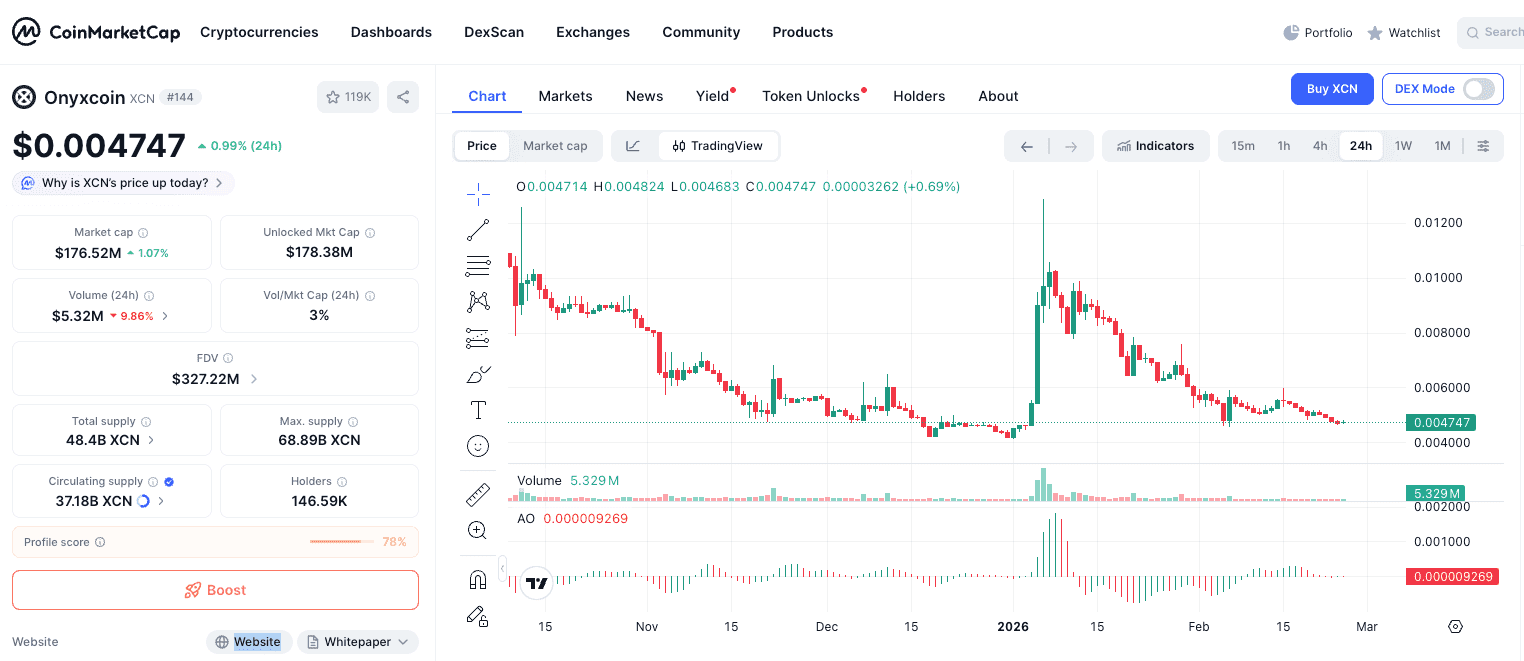 A finales de febrero de 2026, la capitalización de mercado de XCN se sitúa en torno a los 176,52 millones de dólares, con más de 37 mil millones de tokens en circulación (de un suministro total de unos 68,9 mil millones). El ecosistema Onyx incluye componentes clave: el XCN Ledger (una cadena Layer-3 basada en Arbitrum), Goliath (blockchain Layer-1 centrada en interoperabilidad institucional), y el Onyx AI Agent, herramienta de automatización de tareas on-chain. Estas herramientas buscan conectar la infraestructura bancaria tradicional con la tecnología de registros descentralizados.