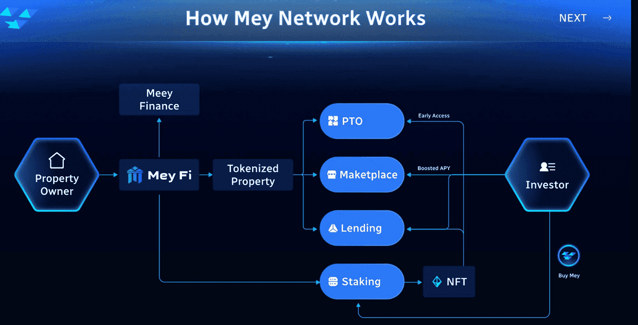 Mey Network est une plateforme basée sur la blockchain concentrée sur la tokenisation immobilière. Sa documentation la présente comme une plateforme mondiale d'investissement immobilier tokenisé, visant à transformer la manière d'investir, gérer et échanger des biens immobiliers. La page de vision expose la volonté de démocratiser l'investissement immobilier, afin de permettre à toute personne d'y participer, indépendamment de sa situation géographique ou de son niveau de richesse. L'écosystème vise à offrir un marché plus sécurisé, transparent et efficace pour les actifs immobiliers tokenisés.