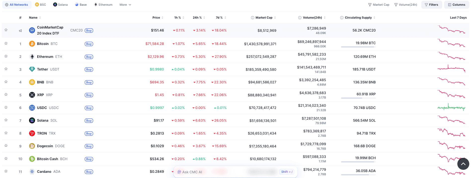 - Bitcoin (BTC): 71 584,28 $, soit -5,65 % sur 24h et -18,44 % sur 7 jours.