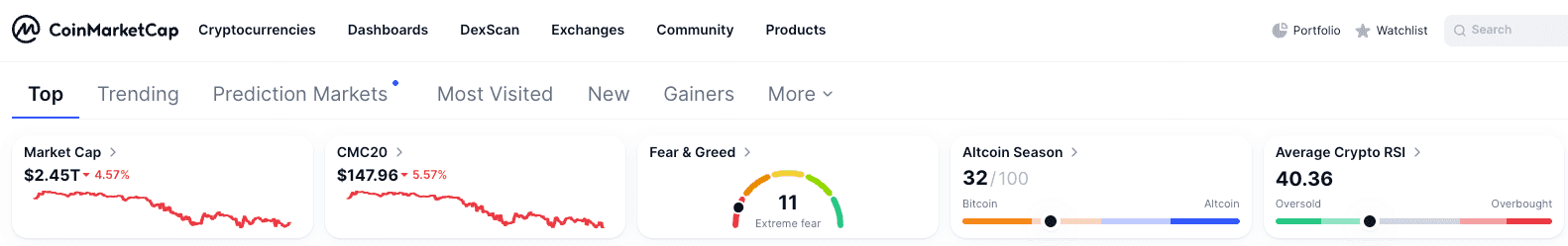 Ce matin, la capitalisation totale du marché des cryptomonnaies a diminué de 4,57 %, atteignant environ 2,45 trillions de dollars. Ce mouvement est encore plus marqué dans l'indice CMC20, qui suit les 20 principaux actifs numériques par capitalisation, affichant une baisse quotidienne de 5,57 %. De plus, l'indice Fear & Greed a atteint 11, synonyme de « peur extrême », ce qui traduit un retournement significatif du sentiment de détail.