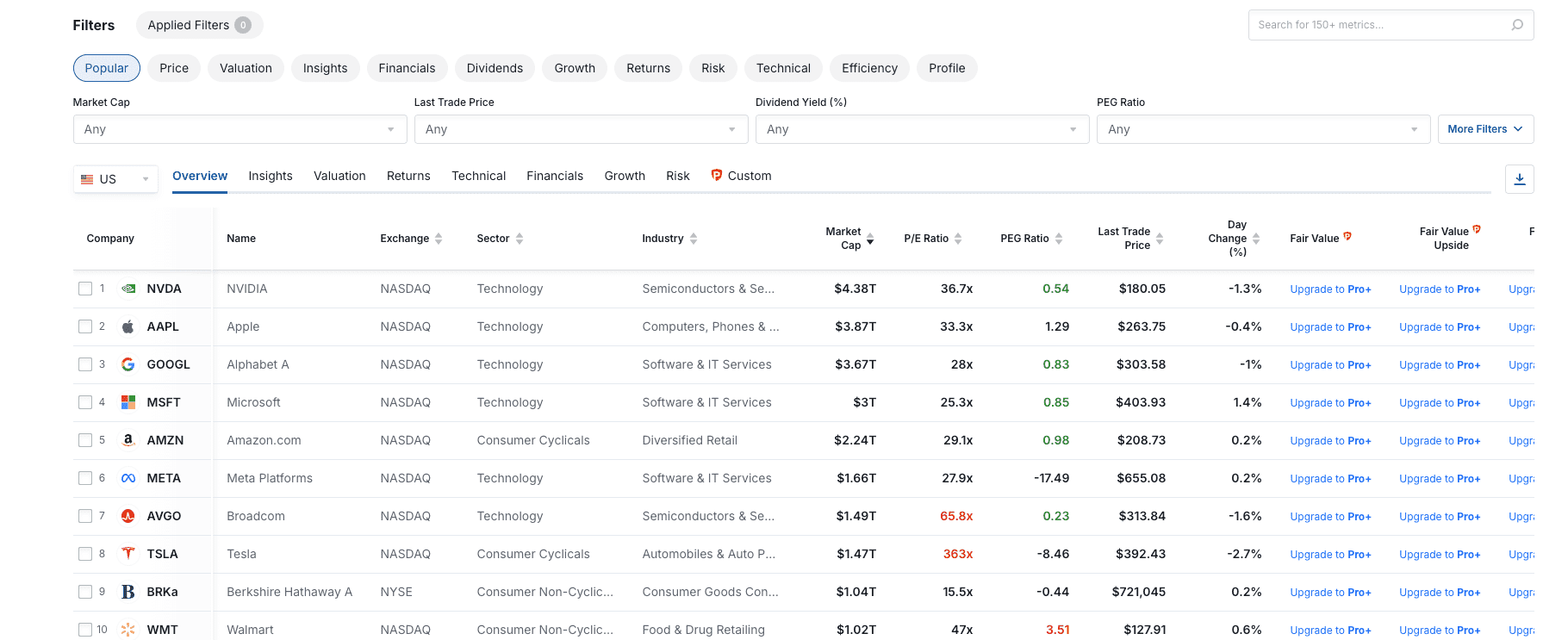 NVIDIA (NVDA) : Actuellement à 180,05 $, en baisse de 1,3 %. Malgré cette correction, sa domination est visible avec une capitalisation de 4,38 T$. Le ratio PEG à 0,54 reste un indicateur clé pour l'évaluation de la croissance par rapport à la valorisation.