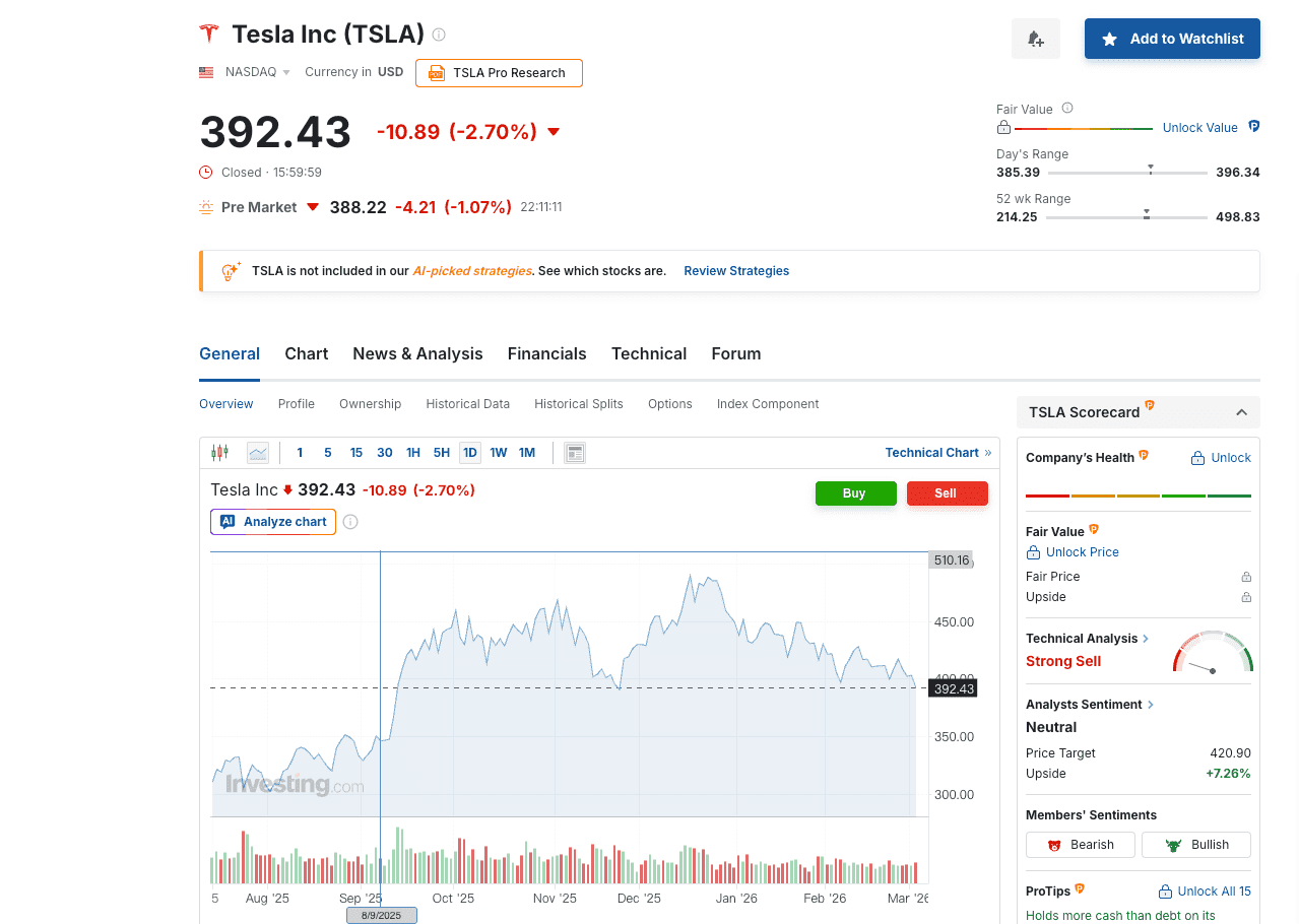 TSLA : 392,43 $ (-2,70 %) | Avant-bourse : 388,22 $