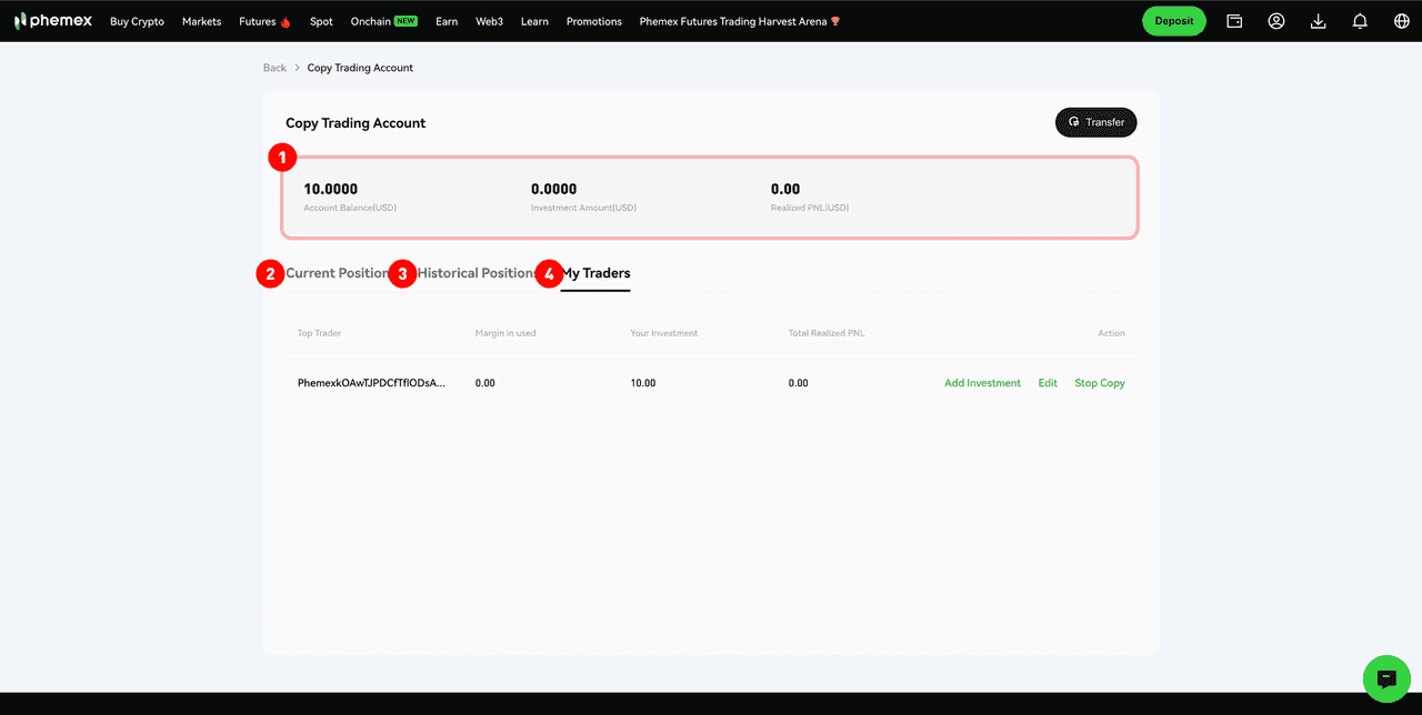 My Traders: Displays the traders you are currently copying, including your total allocated investments and realized PnL. Options to add more funds, adjust settings, or stop copying are also available.