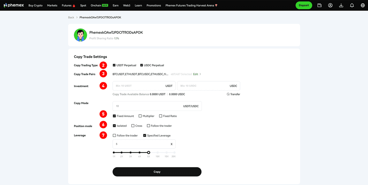 After selecting a trader, you’ll enter the futures copy trading setup page: