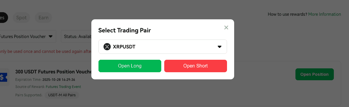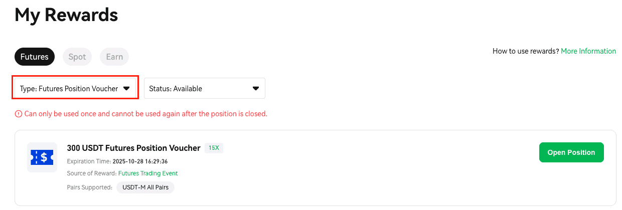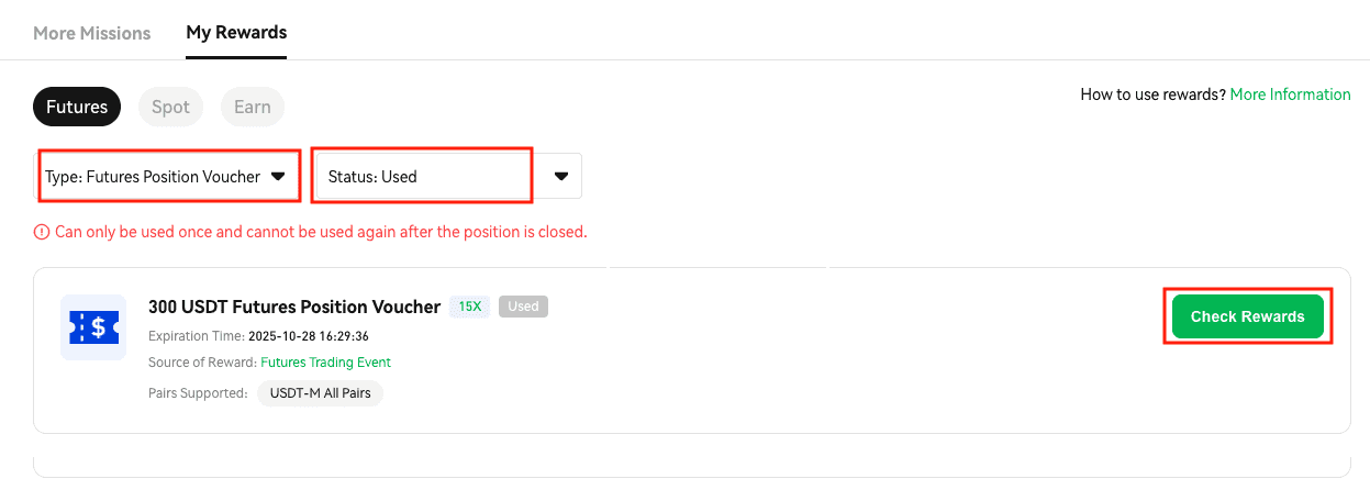 Go back to the “Rewards Hub“ — “My Rewards“ page, select “Futures Position Voucher” and click “Used“ status