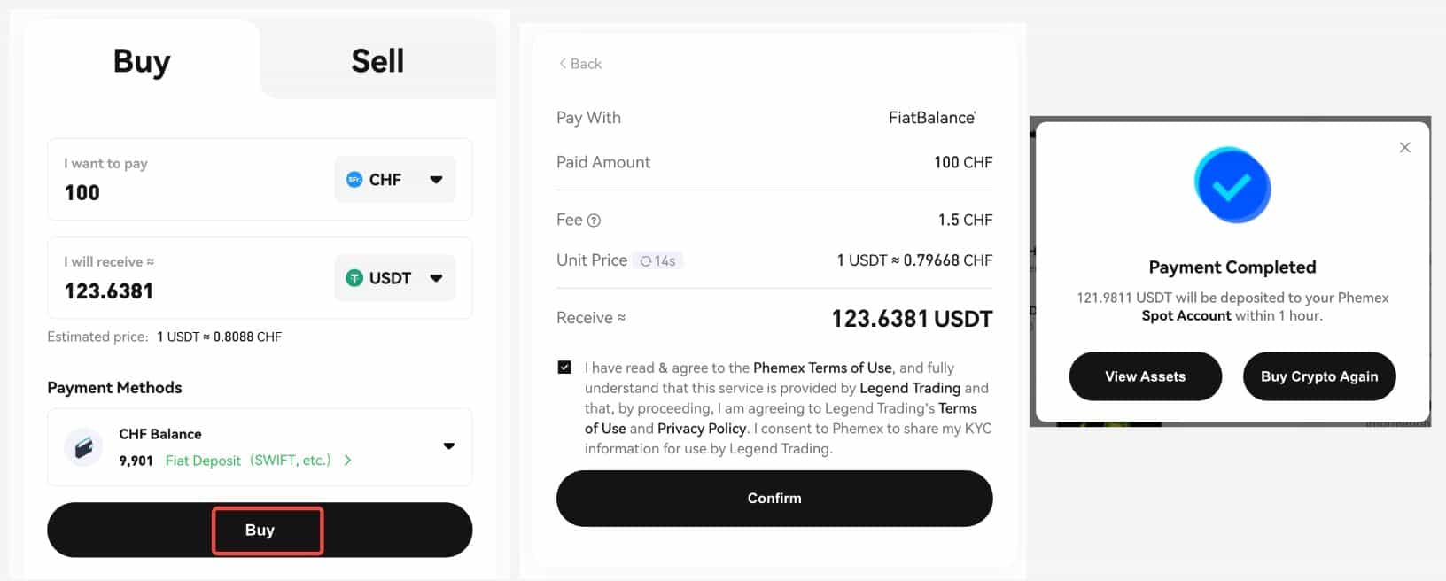 - When the balance is sufficient, then go to the Confirm Order page to check the order details. Click "Confirm" and the crypto will be deposited to your Phemex Spot Account or Futures Account in 1 hour.