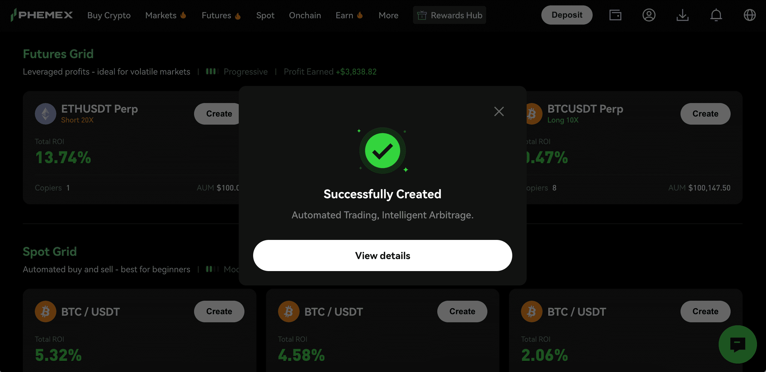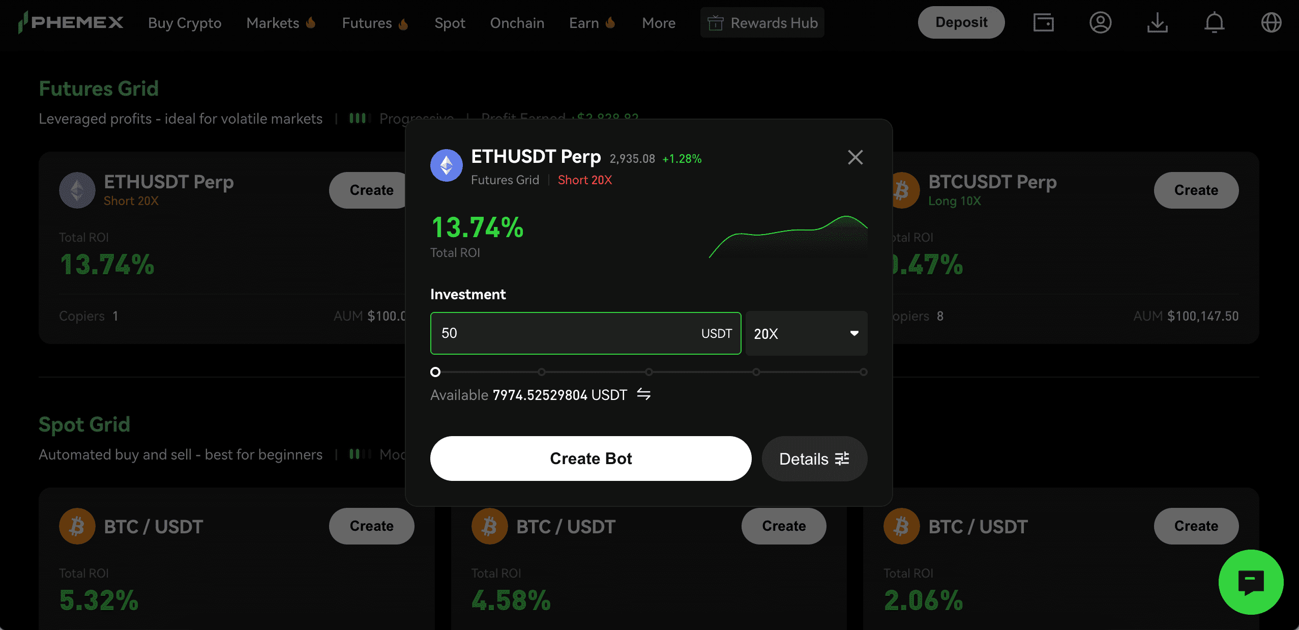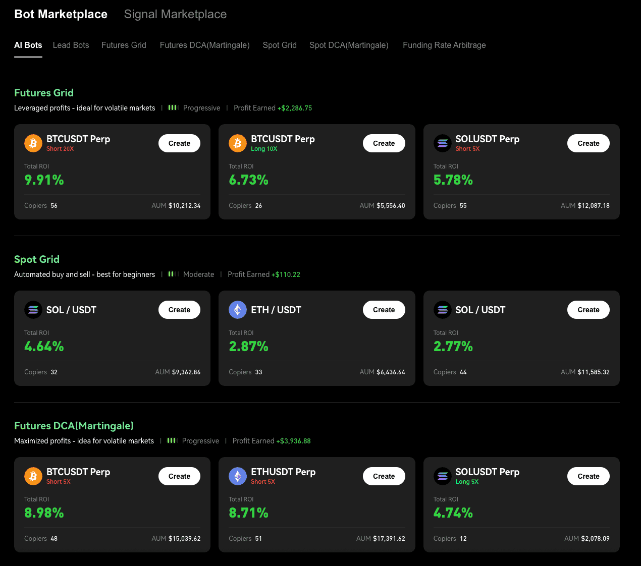 - Click on "Create" and enter the investment amount, then click "Create Bot" to instantly create your AI bot.