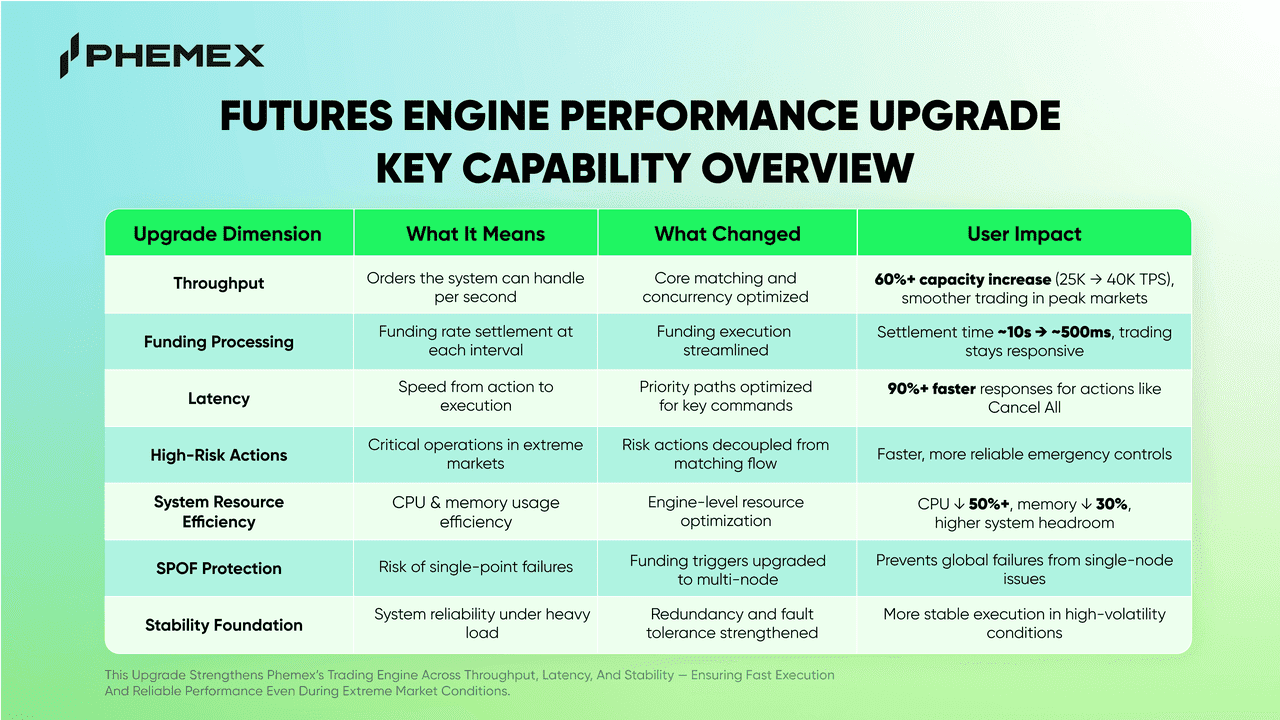 清算エンジンの理解だけでなく、その基盤となるインフラも重要です。極端な相場変動時、一般的な取引所では処理遅延や注文執行の遅れが生じることがあります。Phemexは先物エンジンの大規模アップグレードにより、これらのボトルネックを解消しました。