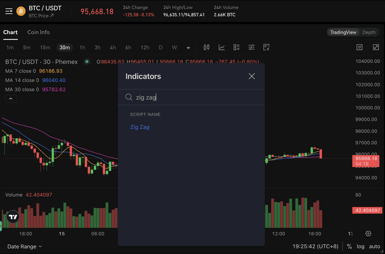 Phemexでジグザグインジケーターを利用する場合、お好きなトレードペアを開きます。ここでは最も取引量の多いBTC/USDTペアを例にします。執筆時点でBTCは$95,750で取引中です: