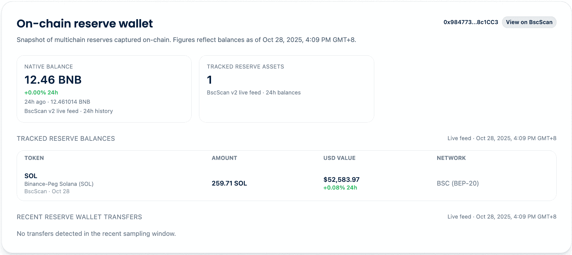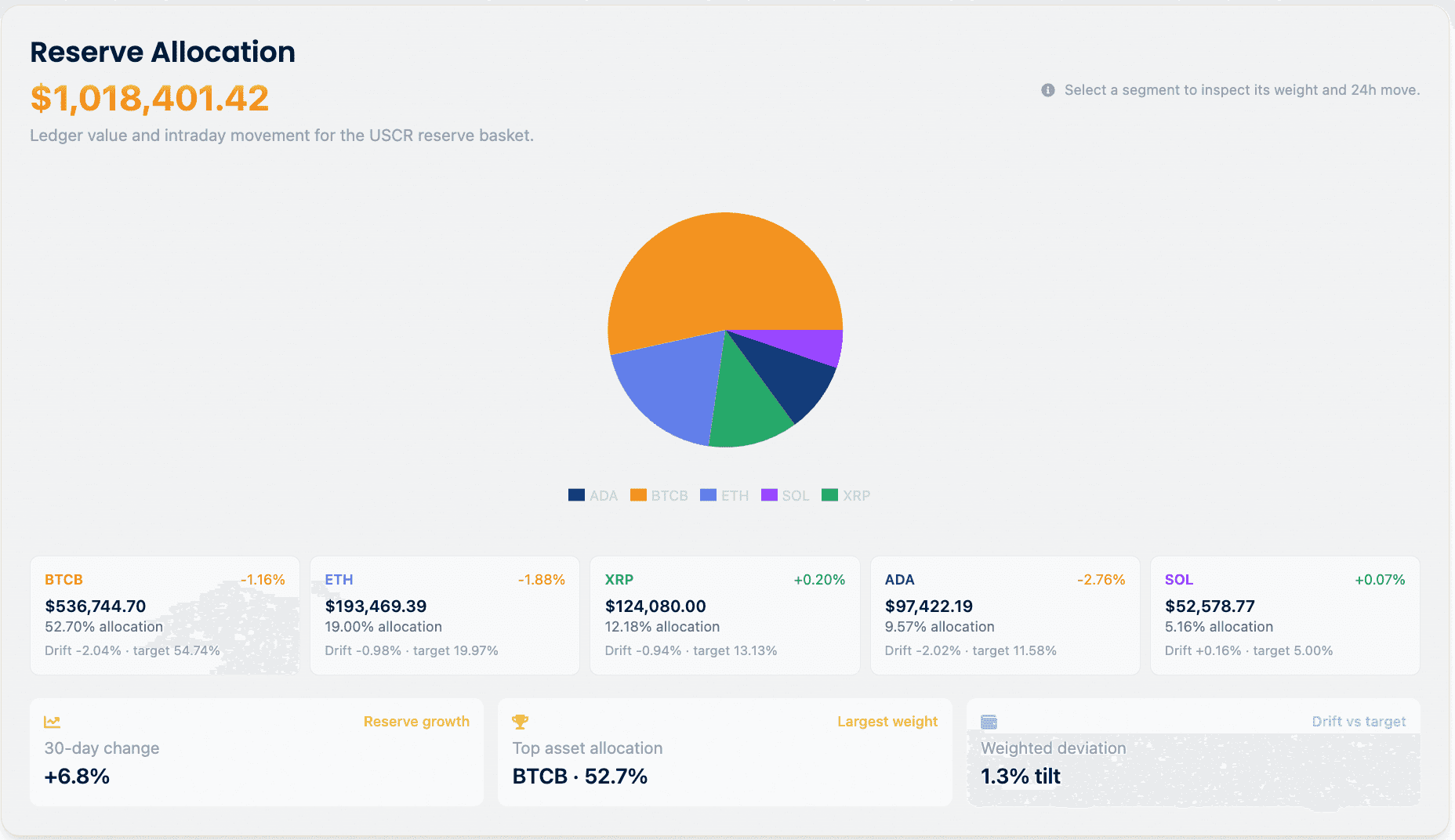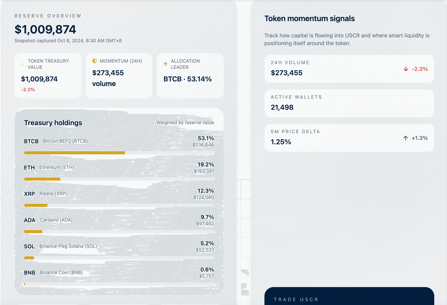- 透明性・オンチェーン準備金 — ほとんどのミームコインが単なるハイプ頼みである中、USCRは実際の暗号資産(BTC・ETH・XRP・ADA等)によるオンチェーン準備金が標榜され、全取引がSolanaチェーン上で可視化=監査可能。“Don’t trust, verify!”型の思想が差別化要素。透明性キープが可能なら、ミーム系でも中長期の信頼醸成へつなげる余地。