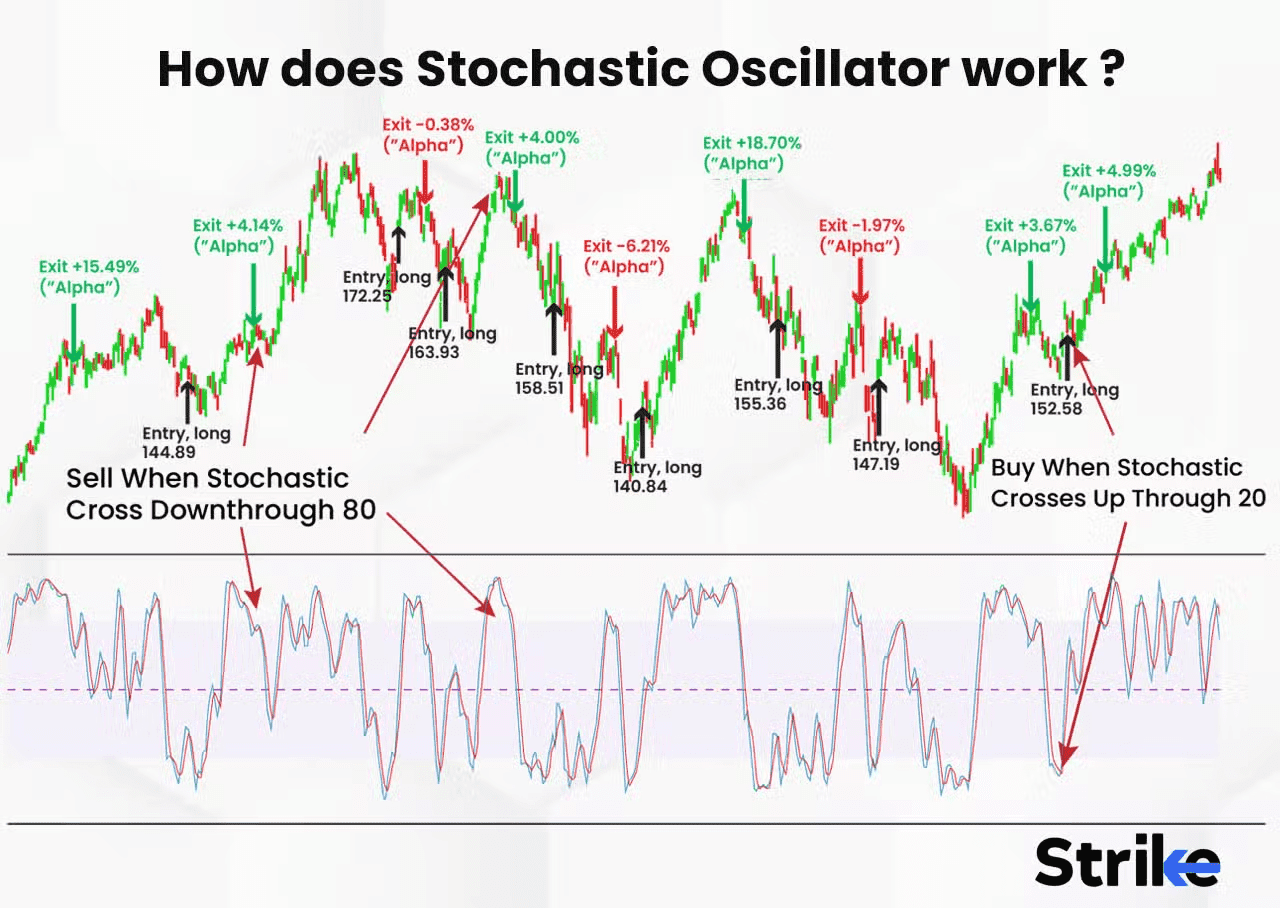 스토캐스틱 오실레이터는 변동성이 큰 크립토 시장에서 다음과 같이 활용됩니다: