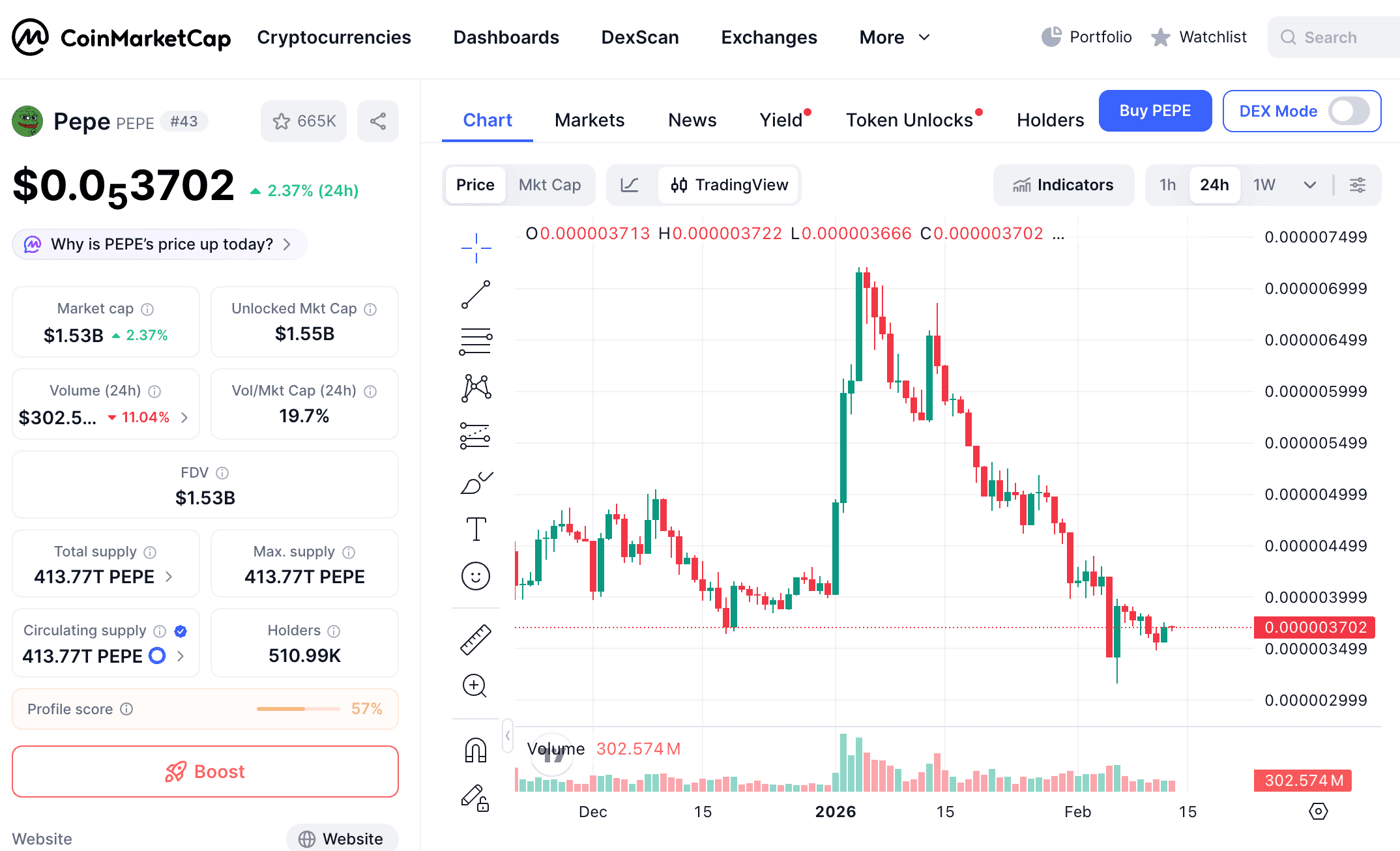PEPE는 상위 밈 자산 중 모멘텀 리더로, 현재 $0.0₅3702에 거래되고 있으며, 최근 24시간 동안 2.25% 상승했습니다.