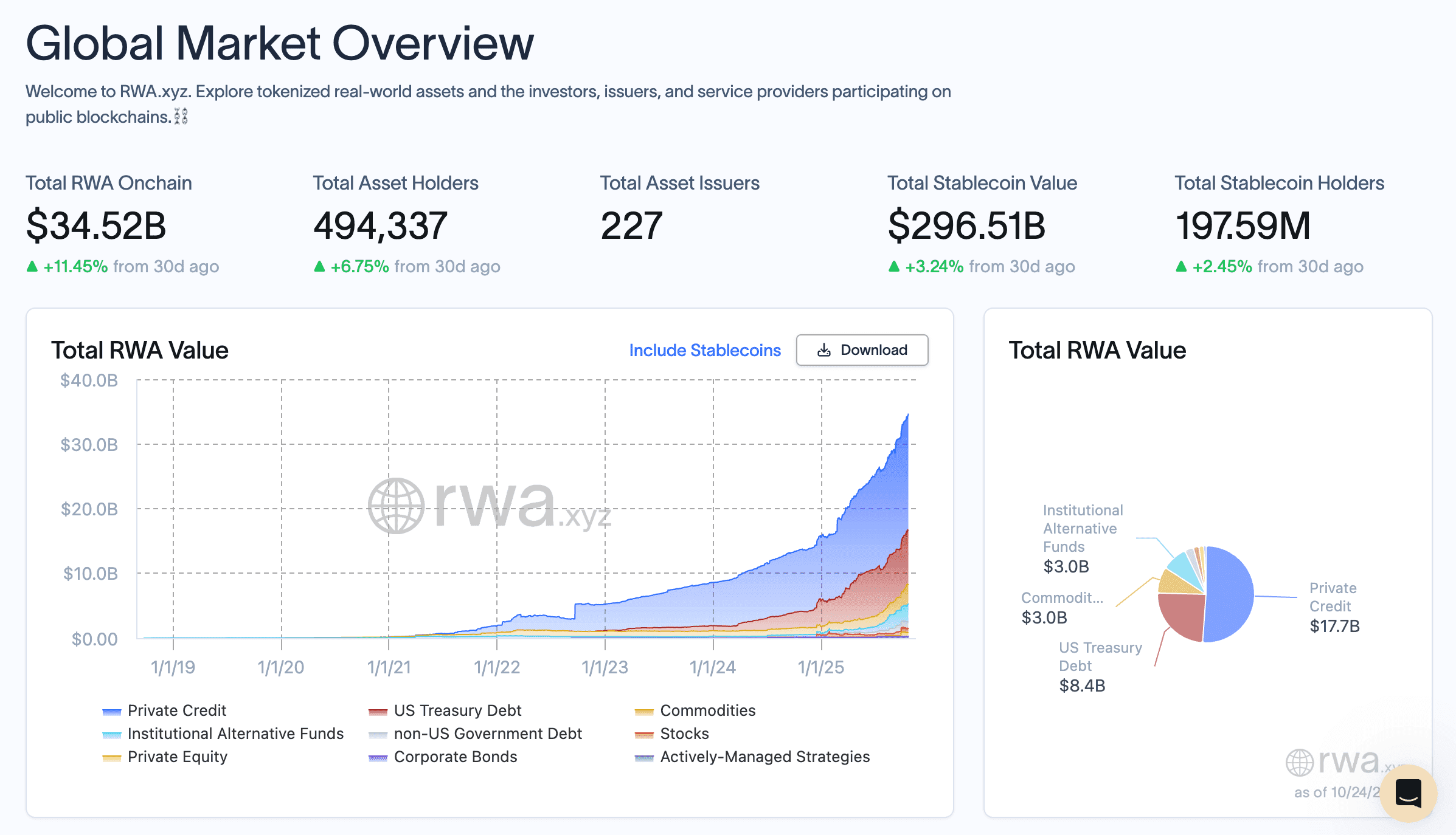현재 시가총액: 2025년 10월 24일 기준 RWA.xyz 집계, RWA 시장 시총은 348억 6천만 달러.