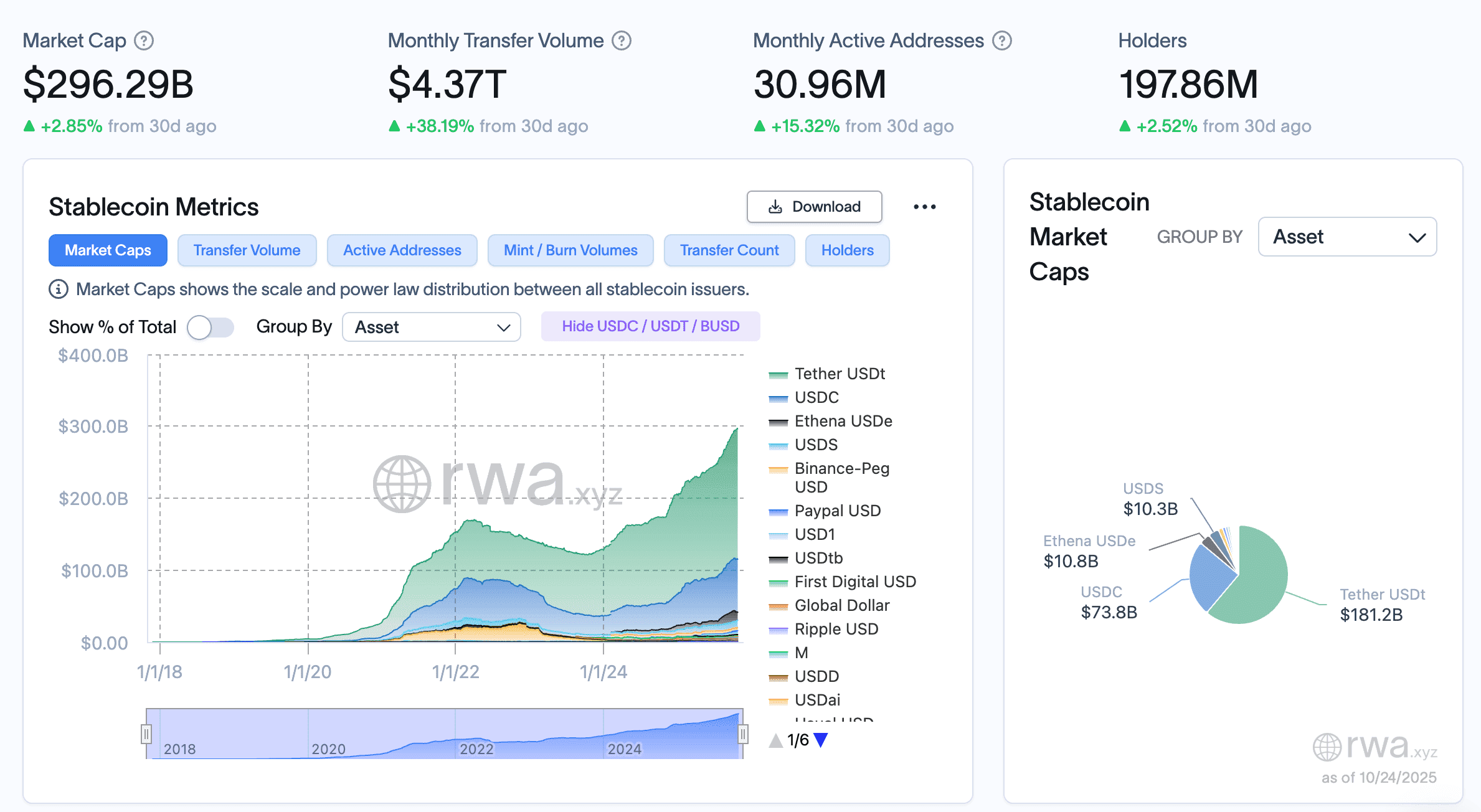시장 가치: 스테이블코인 시총 2,962억 9천만 달러(RWA.xyz 기준), 최근 30일 2.85% 성장, USDT·USDC가 주도.