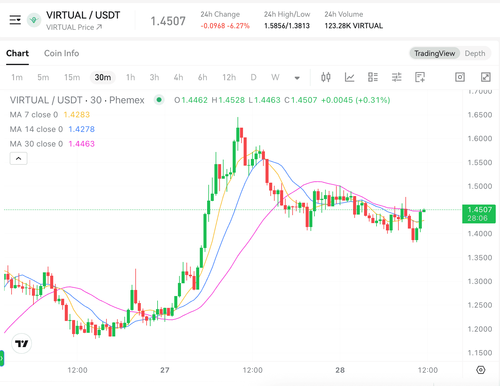 현재 Virtuals Protocol의 가격은 $1.45로, 주중 최고가 $1.63 이후 24시간 기준 6.27% 하락했습니다.