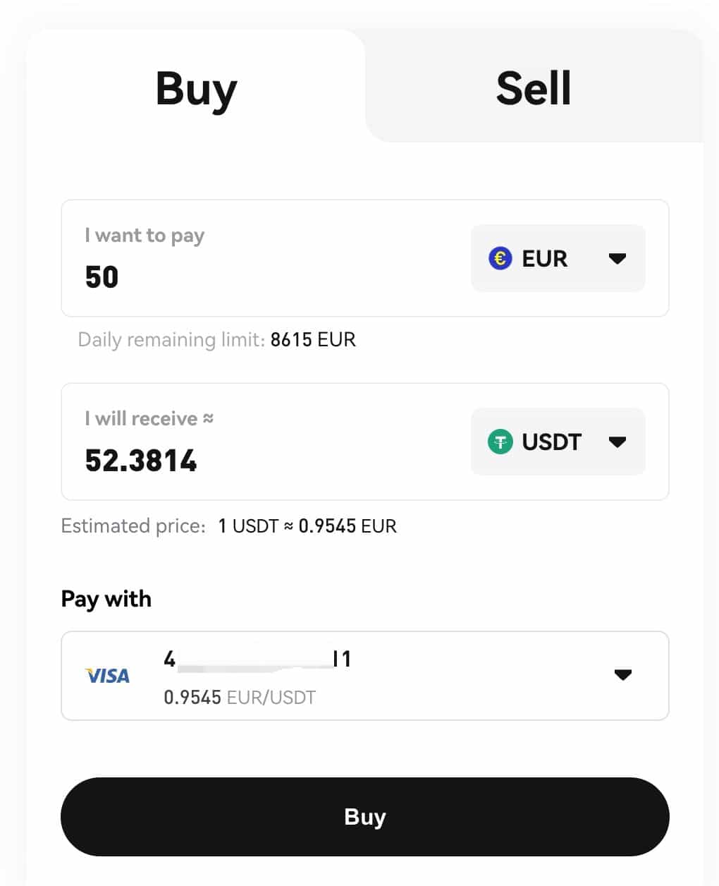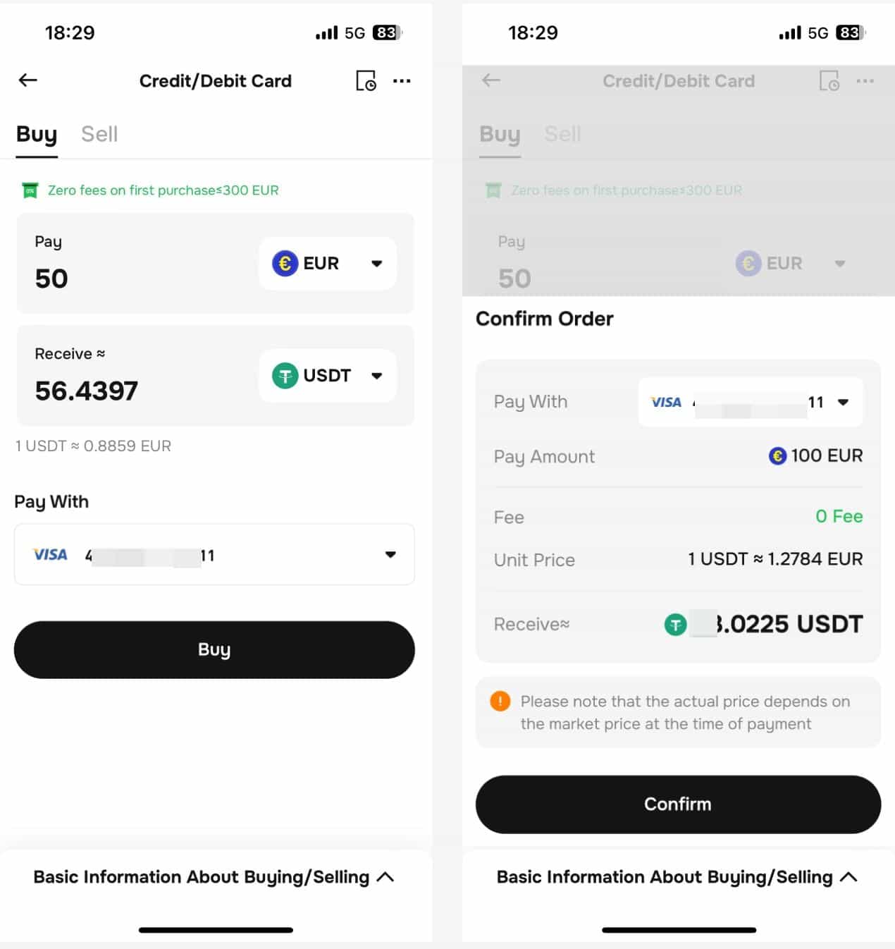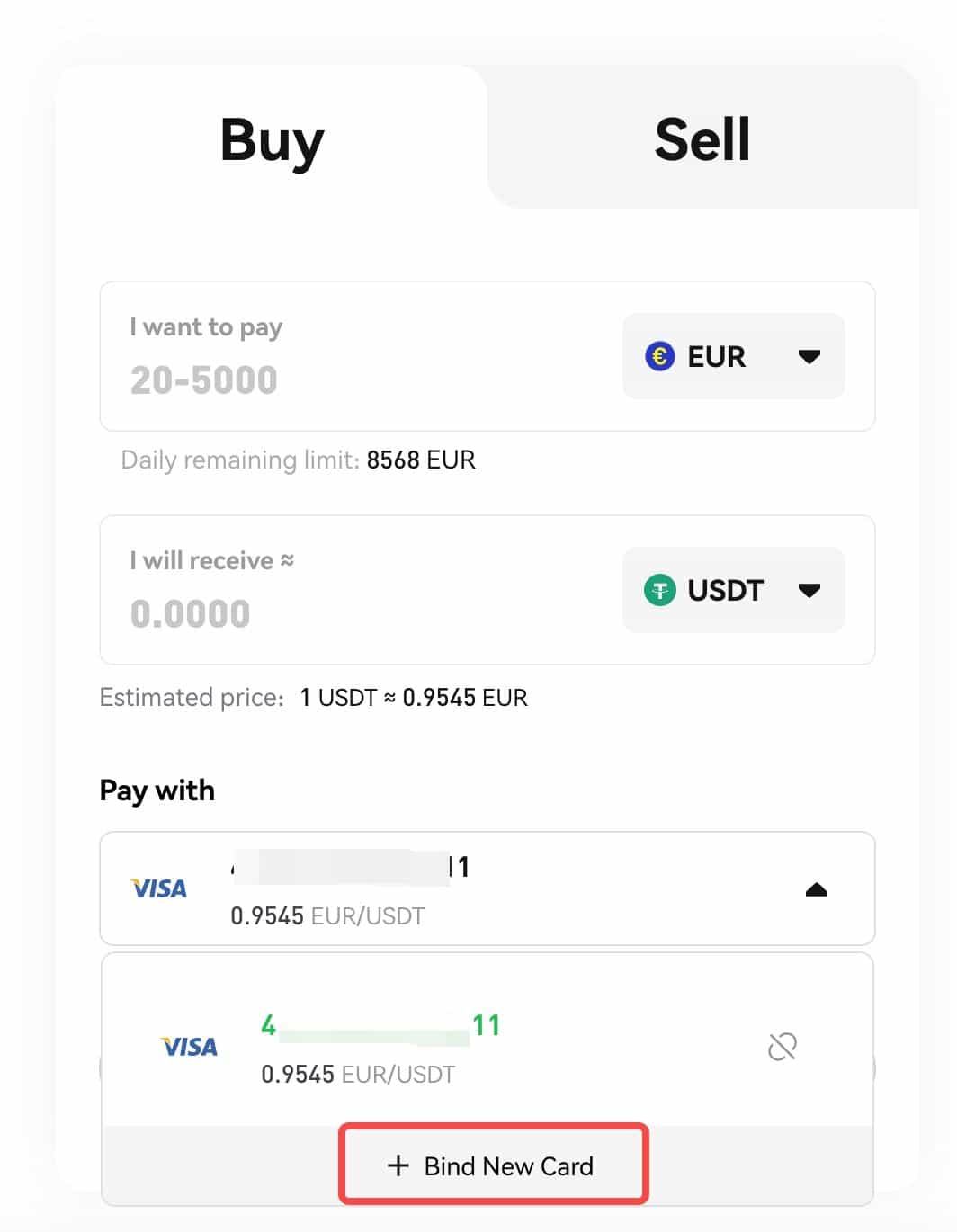 3. 카드 등록이 완료되면 해당 카드로 암호화폐를 구매할 수 있습니다. 암호화폐 구매 메인 페이지로 돌아가서 사용 또는 받고자 하는 금액을 입력한 후 "구매"를 클릭하고 주문 확인 단계로 이동하세요. 등록된 카드 중 하나를 선택해 결제하거나, 새로 카드를 추가할 수 있습니다.