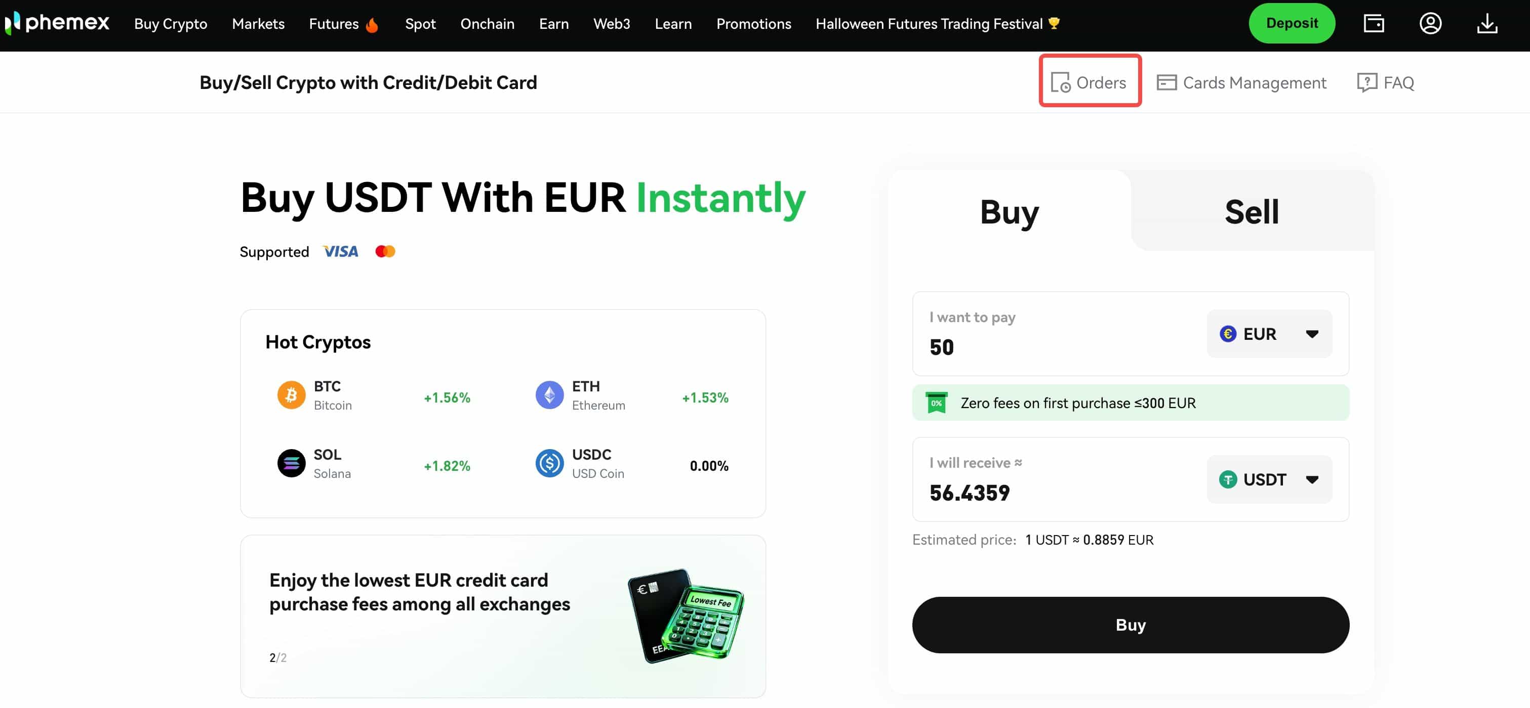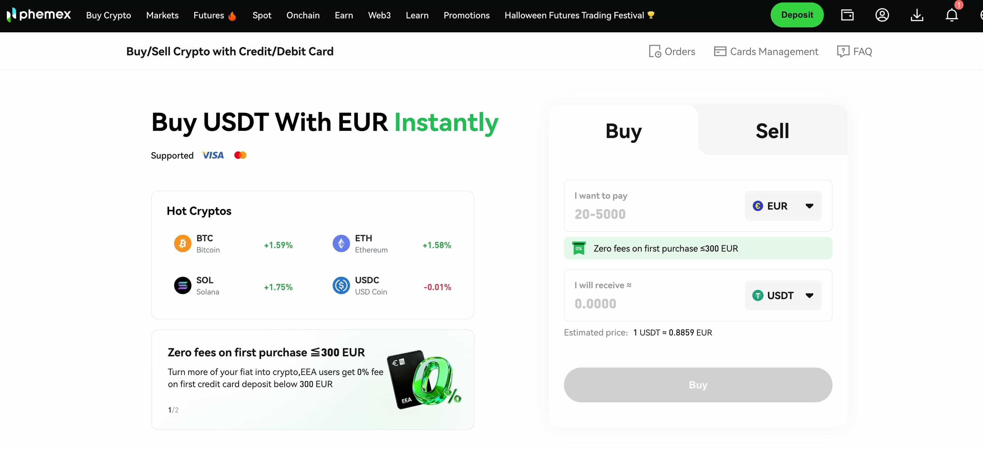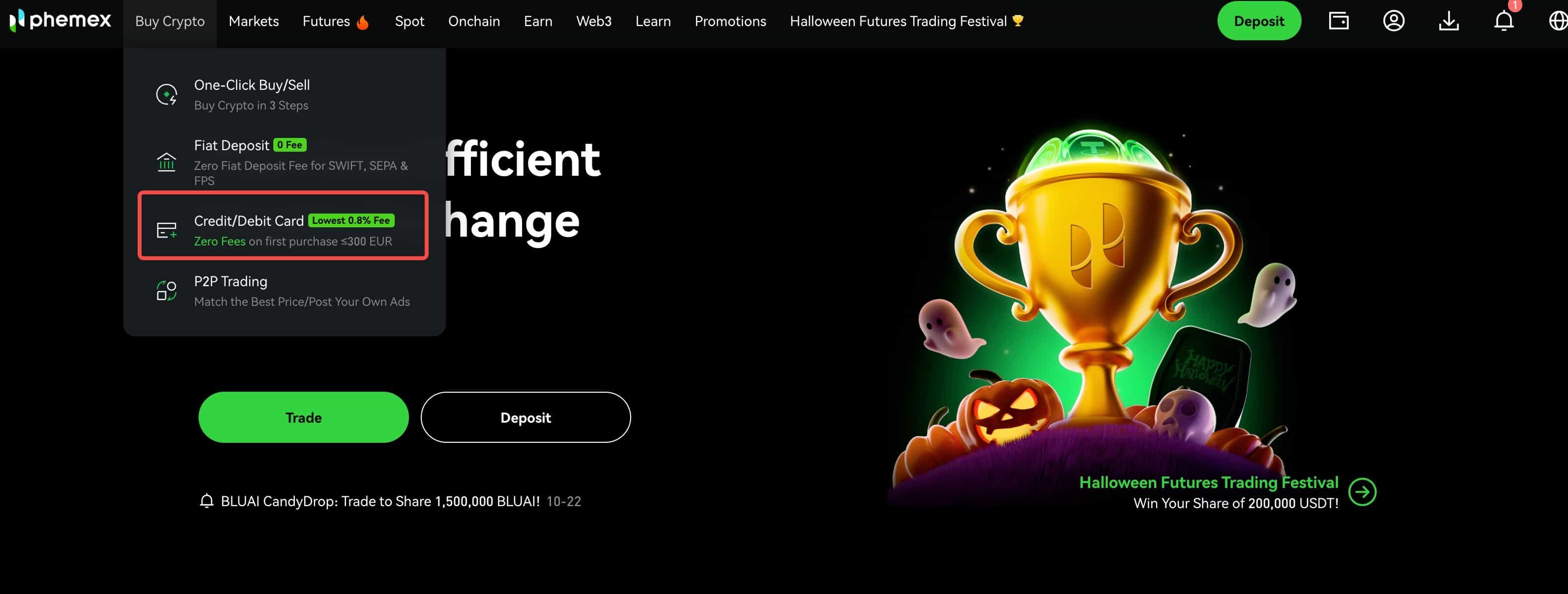 1. Phemex 계정에 가입하거나 로그인했는지 확인하세요. 상단 메뉴에서 ‘암호화폐 구매’에 마우스를 올린 뒤 ‘신용/체크카드’를 클릭하세요.