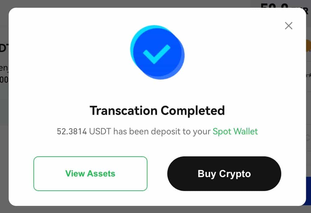 3D Secure 코드를 입력하라는 메시지가 표시될 수 있으며, 결제를 완료하면 구매한 암호화폐가 현물 지갑에 입금됩니다. “자산 보기”를 눌러 잔액을 확인할 수 있습니다.