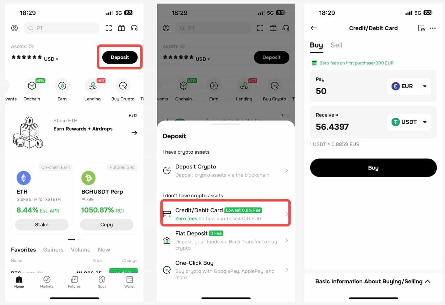 1. Phemex 계정에 가입하거나 로그인했는지 확인하세요. 앱 메인 화면에서 “입금”을 클릭한 후 "신용/체크카드"를 선택하세요.
