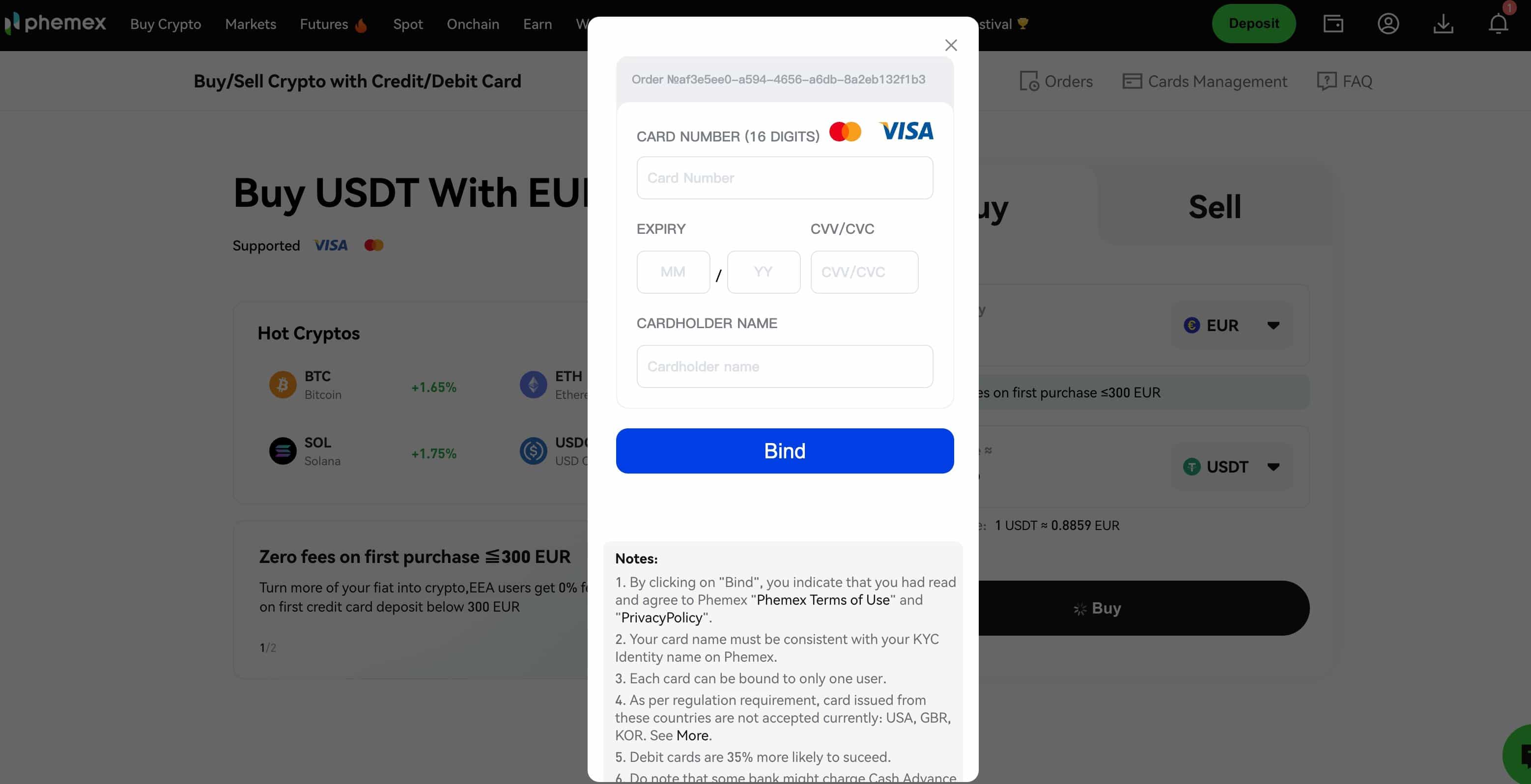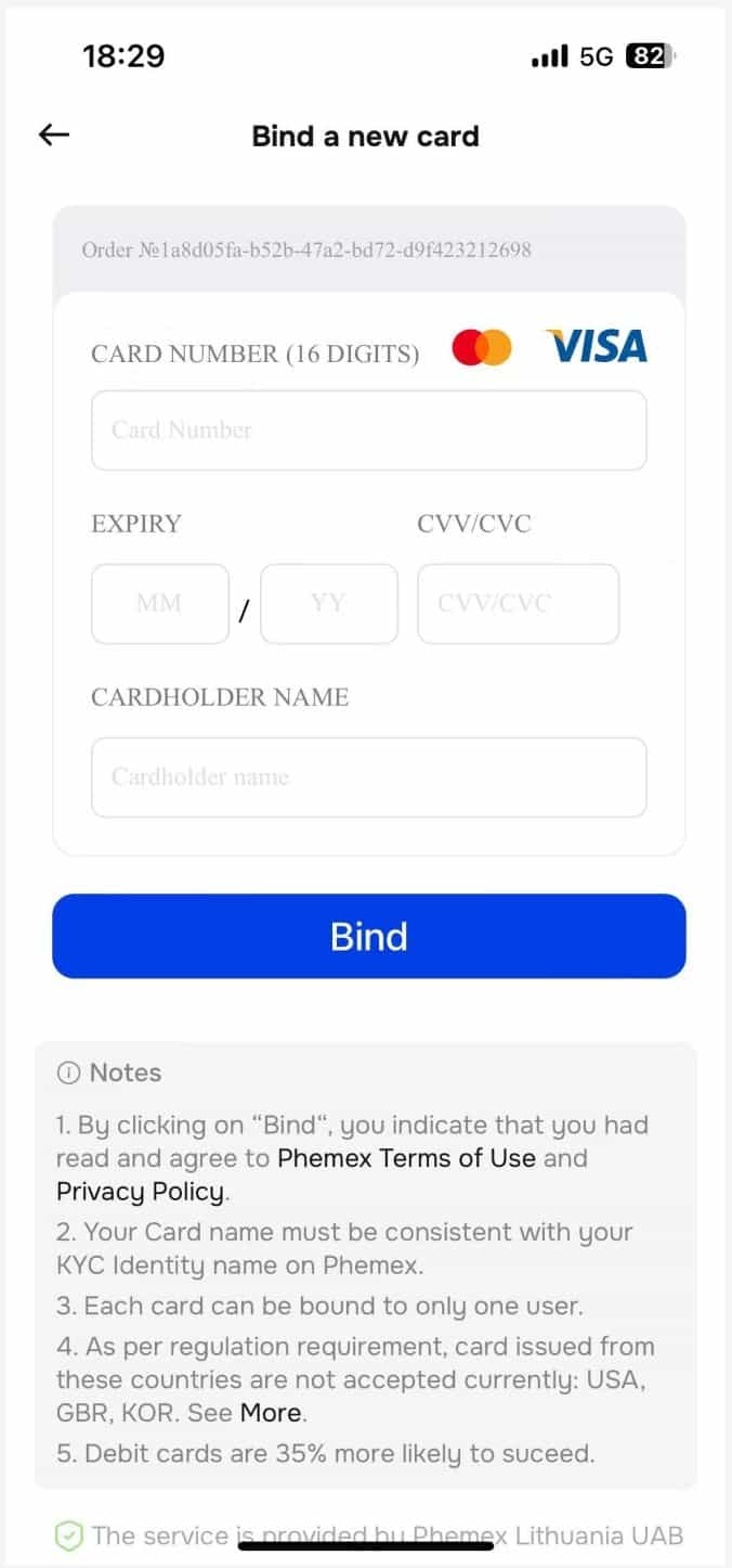 2.2. 아직 카드를 등록하지 않았다면 카드 등록을 먼저 진행해주세요. 신용/체크카드 정보를 입력하세요. 본인 명의의 카드로만 결제할 수 있으니, 카드 소유자 이름이 Phemex의 KYC 신원 인증 이름과 일치해야 합니다.