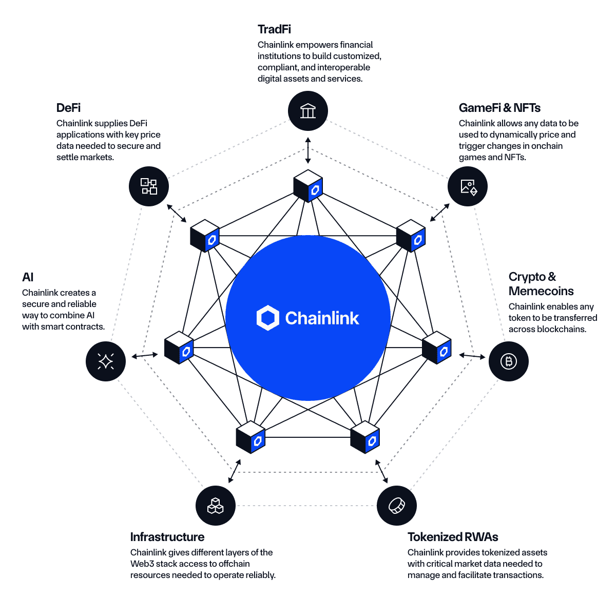 O Chainlink é a principal rede de oráculos descentralizados que conecta blockchains a dados do mundo real. Sua missão central é atuar como middleware confiável, fornecendo informações externas (como preços de ativos, taxas de juros ou dados de APIs) para contratos inteligentes de forma segura e resistente a manipulações. No contexto de RWA, o Chainlink desempenha papel fundamental ao entregar dados off-chain, como preços de commodities para tokens de ouro, benchmarks para tokens de títulos ou prova de reservas para ativos sob custódia.