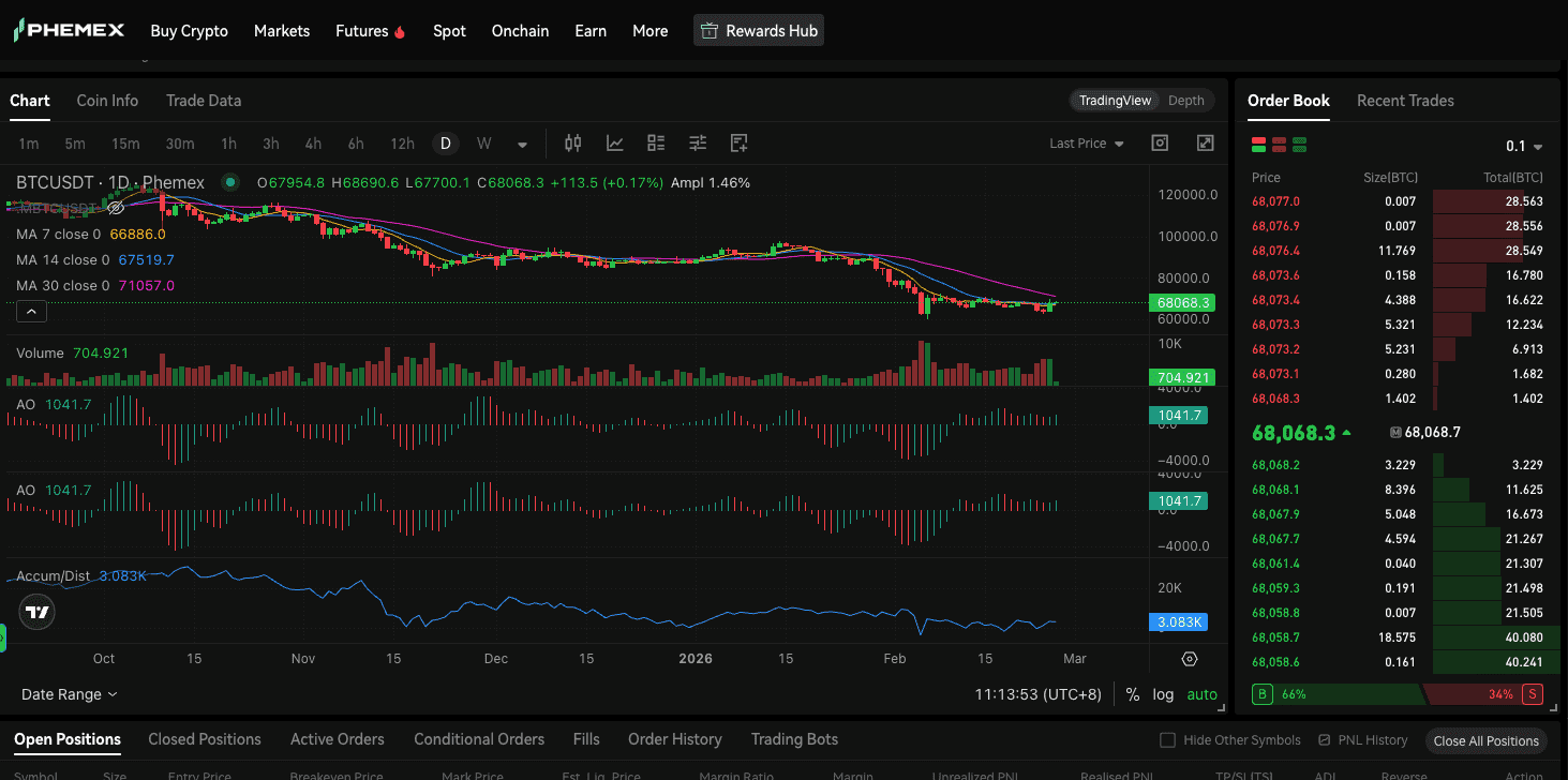 Na interface de contratos da Phemex, esta parede de compra está concentrada em torno de US$68.058. Na mecânica de mercado, uma parede de compra atua como suporte técnico. Desde que o preço permaneça acima desta zona de liquidez, tecnicamente o “caminho de menor resistência” tende a ser ascendente. Para quem opera na Phemex, os dados mostram que recuos pontuais até a faixa dos US$68 mil encontram compradores ativos.