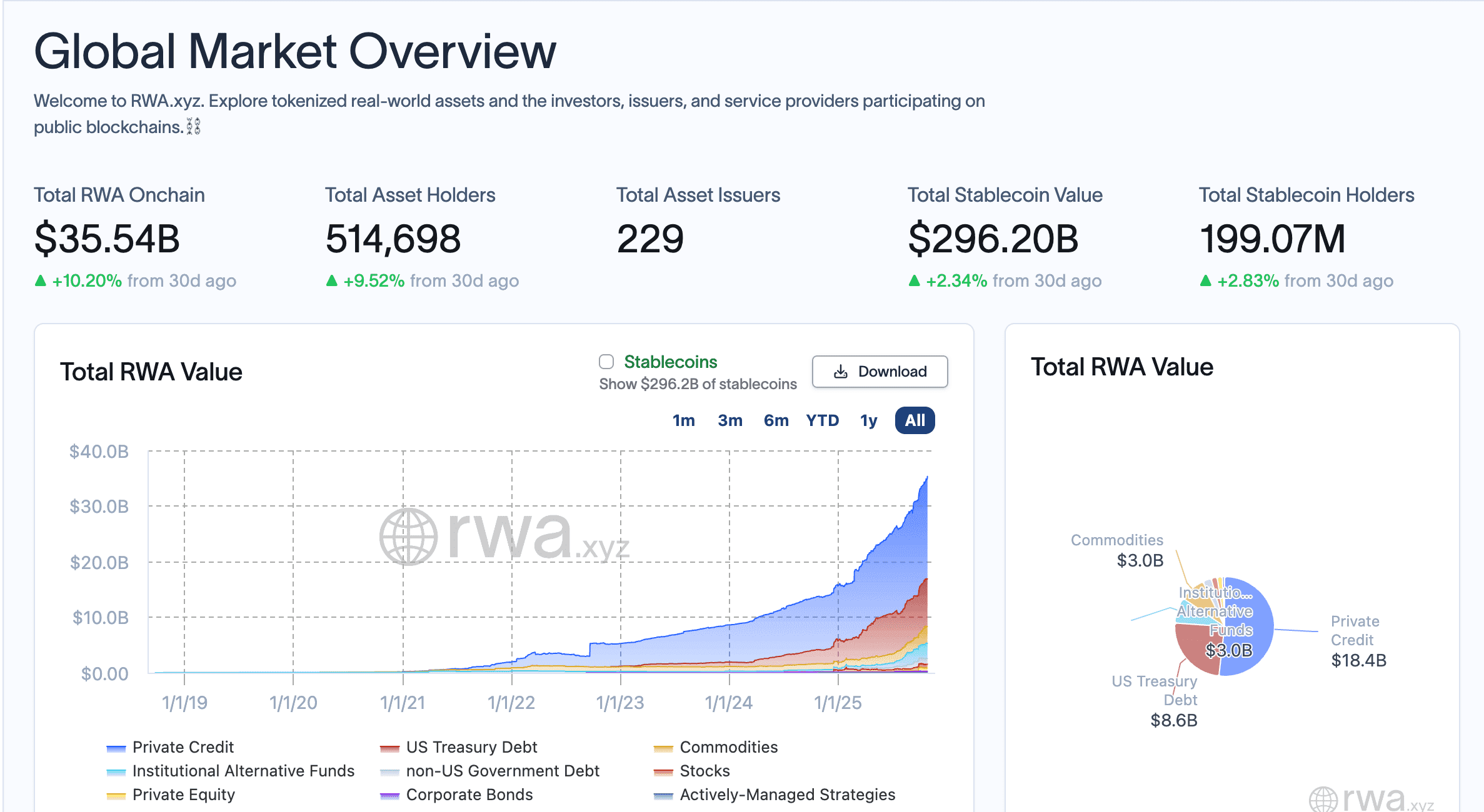 O valor atual on-chain de US$ 35,54 bilhões em RWA não é um bloco único. Trata-se de um portfólio diversificado, evidenciando um mercado maduro e sofisticado, com mais de 514 mil detentores de ativos.