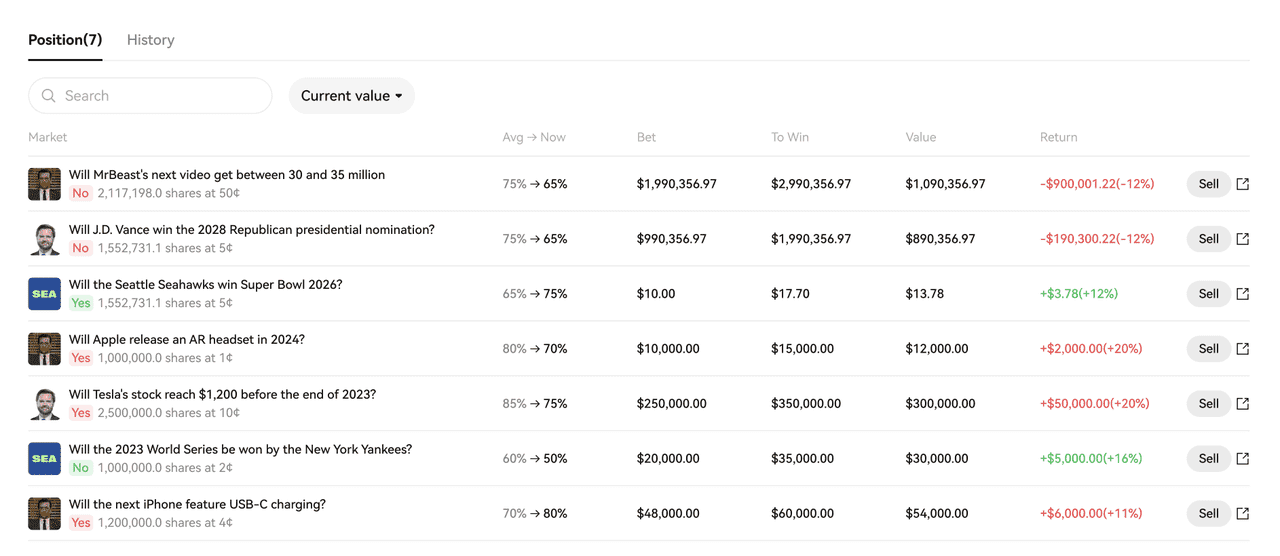 После открытия сделки вы можете отслеживать её на странице события во вкладке Positions. Там отображаются количество ваших долей по исходам, динамика вероятности, размер сделки, текущая стоимость и результат.