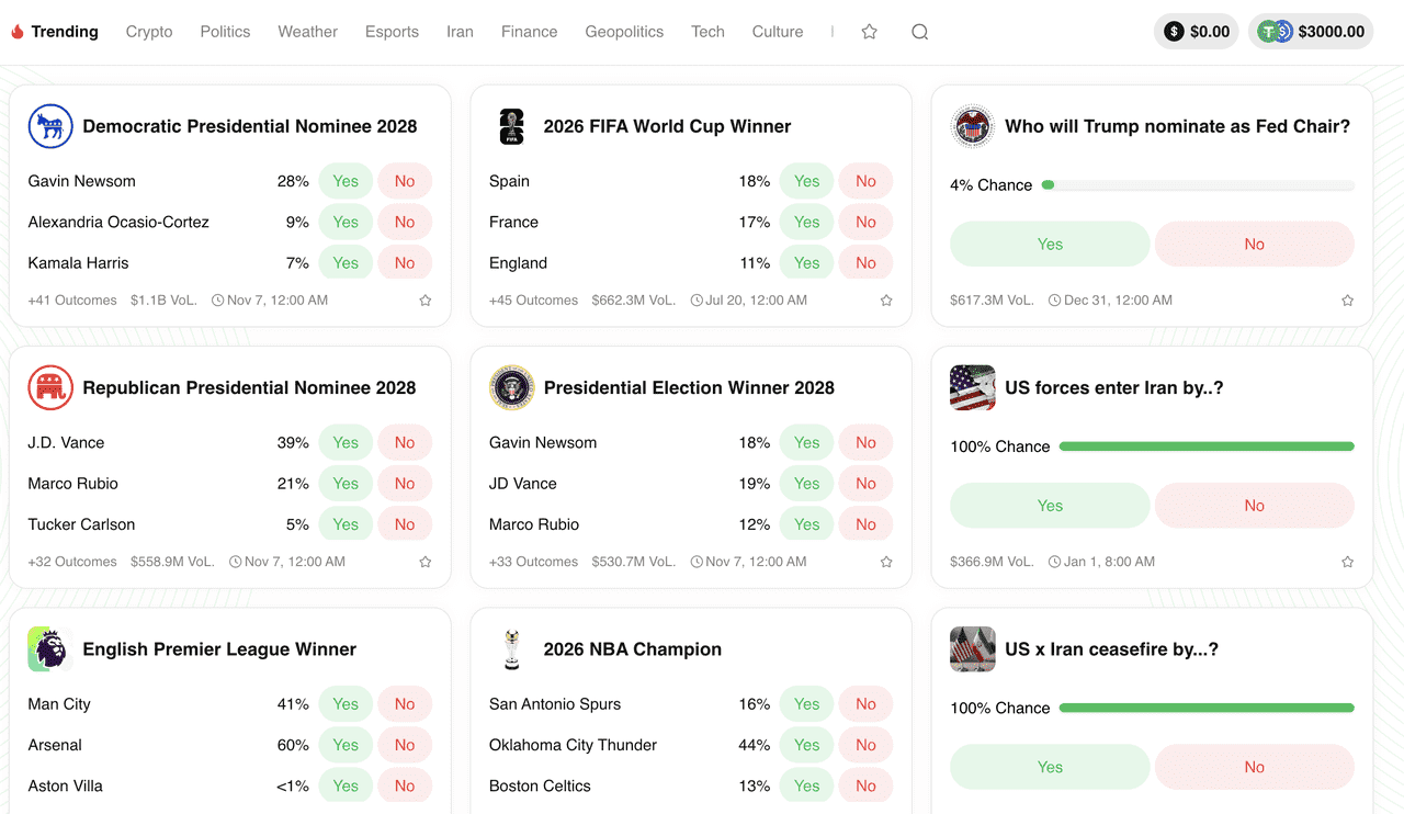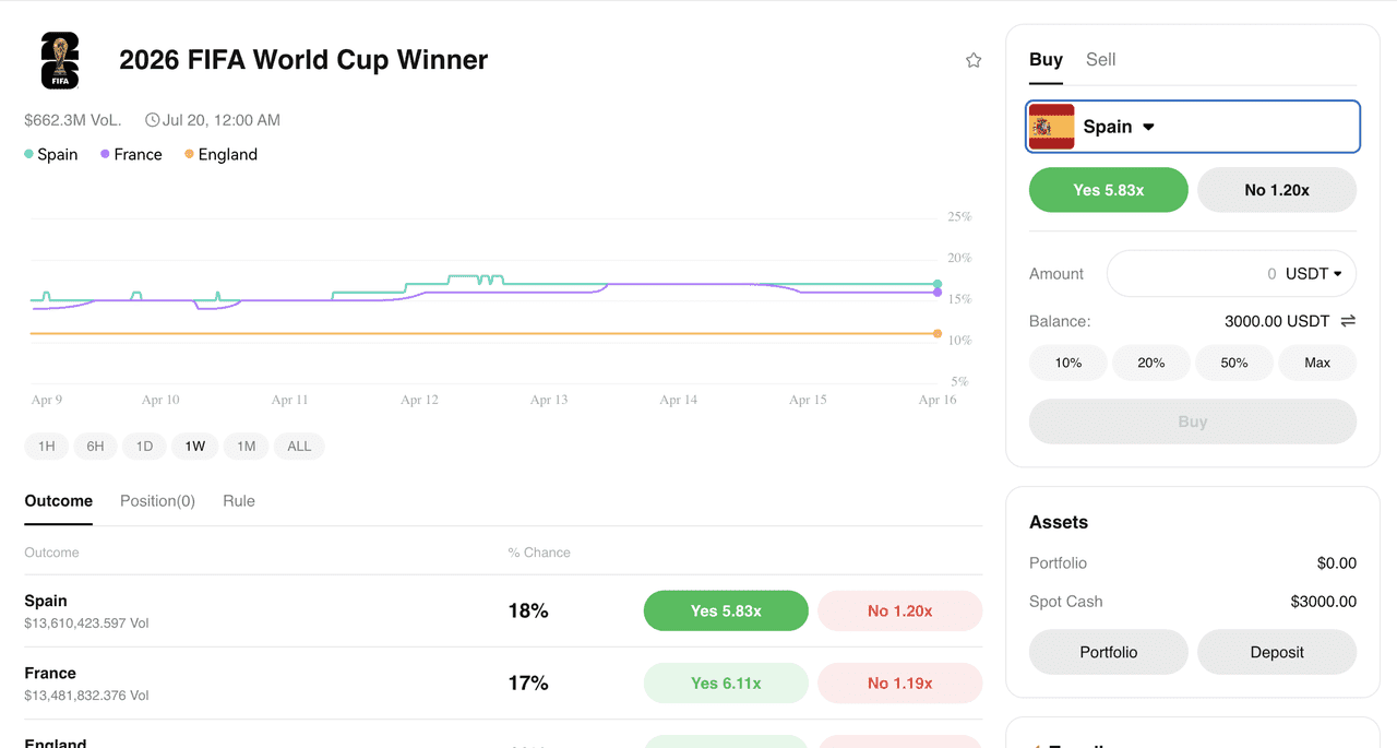 В разделе Prediction Market вы увидите список актуальных событий для торговли. Рынки собраны по категориям: криптовалюты, политика, погода, спорт, геополитика и др. Ваш баланс отображается в правом верхнем углу.