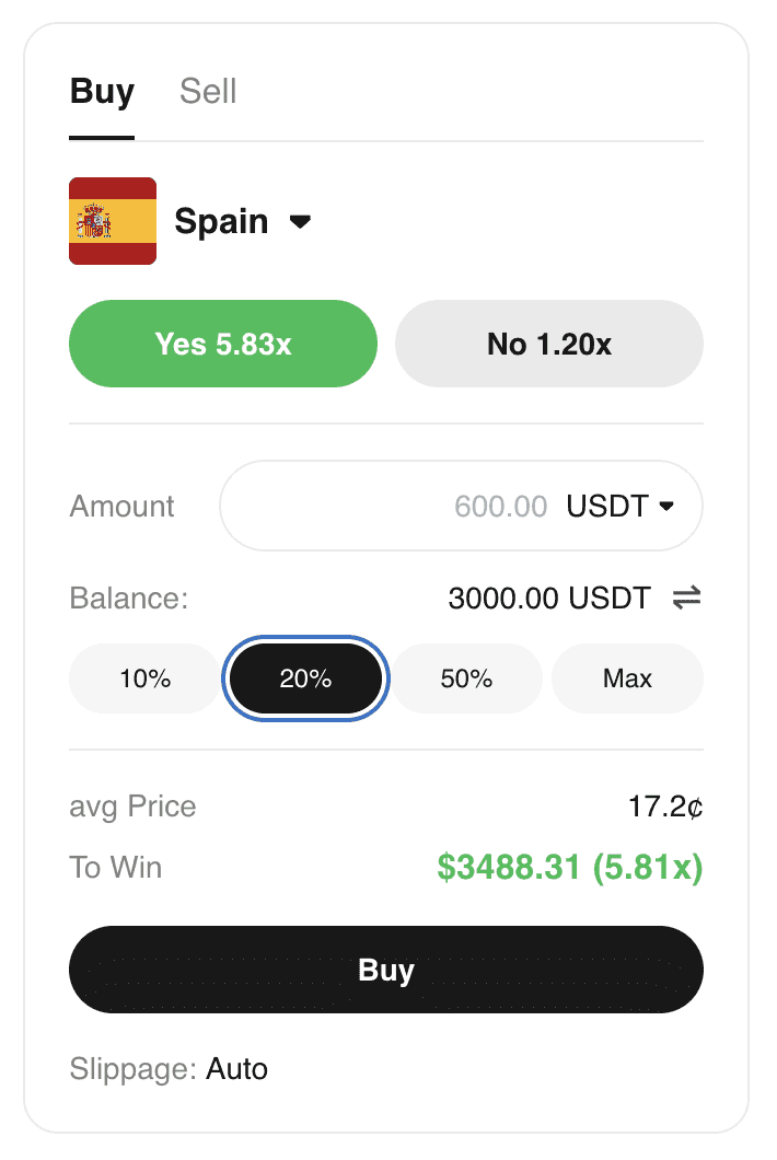 После выбора варианта нажмите YES или NO — появится поле для ввода суммы. Там же видна минимальная ставка и потенциальный выигрыш с учётом прогноза и размера позиции. Для торговли используются USDT или USDC. После ввода суммы нажмите "Buy Yes" или "Buy No".
