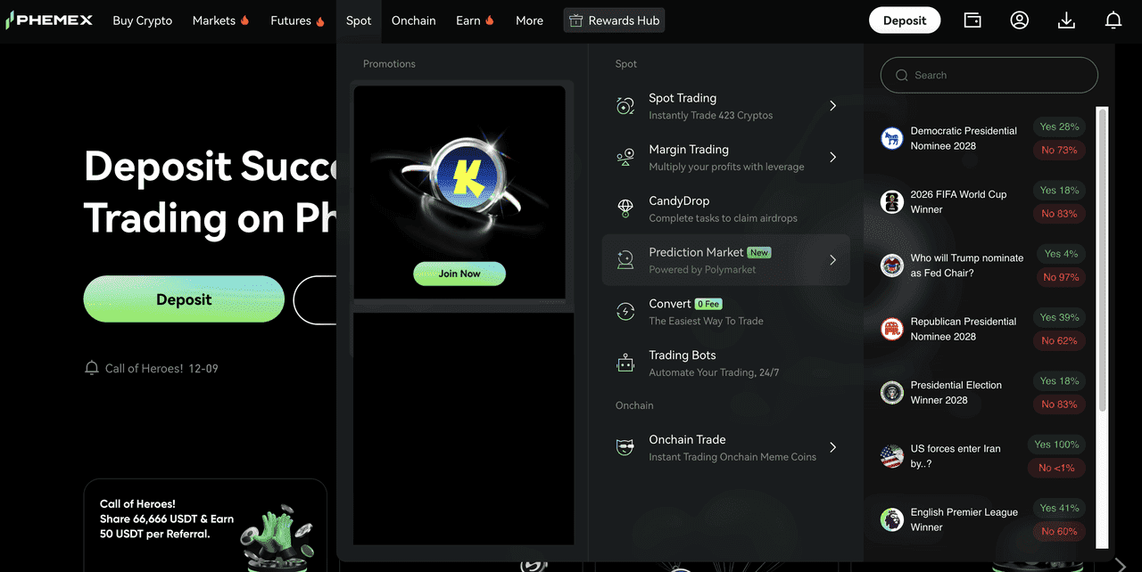 Перейдите в продукт "Рынок прогнозов Phemex", наведя курсор на вкладку Spot в верхнем меню и выбрав Prediction Market. На главной странице вы увидите список доступных рынков.