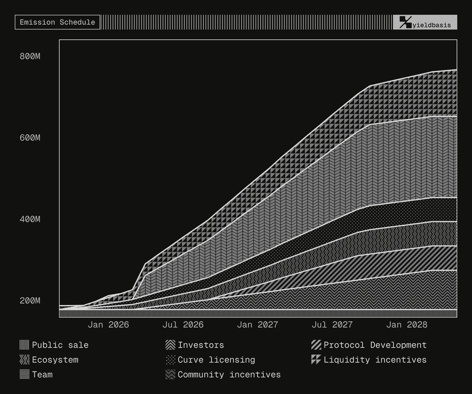 Токеномика Yield Basis тщательно продумана для обеспечения долгосрочной стабильности и выравнивания интересов пользователей, команды разработчиков и инвесторов. Максимальное предложение токенов YB навсегда ограничено 1 миллиардом, и новых токенов выпускаться не будет.