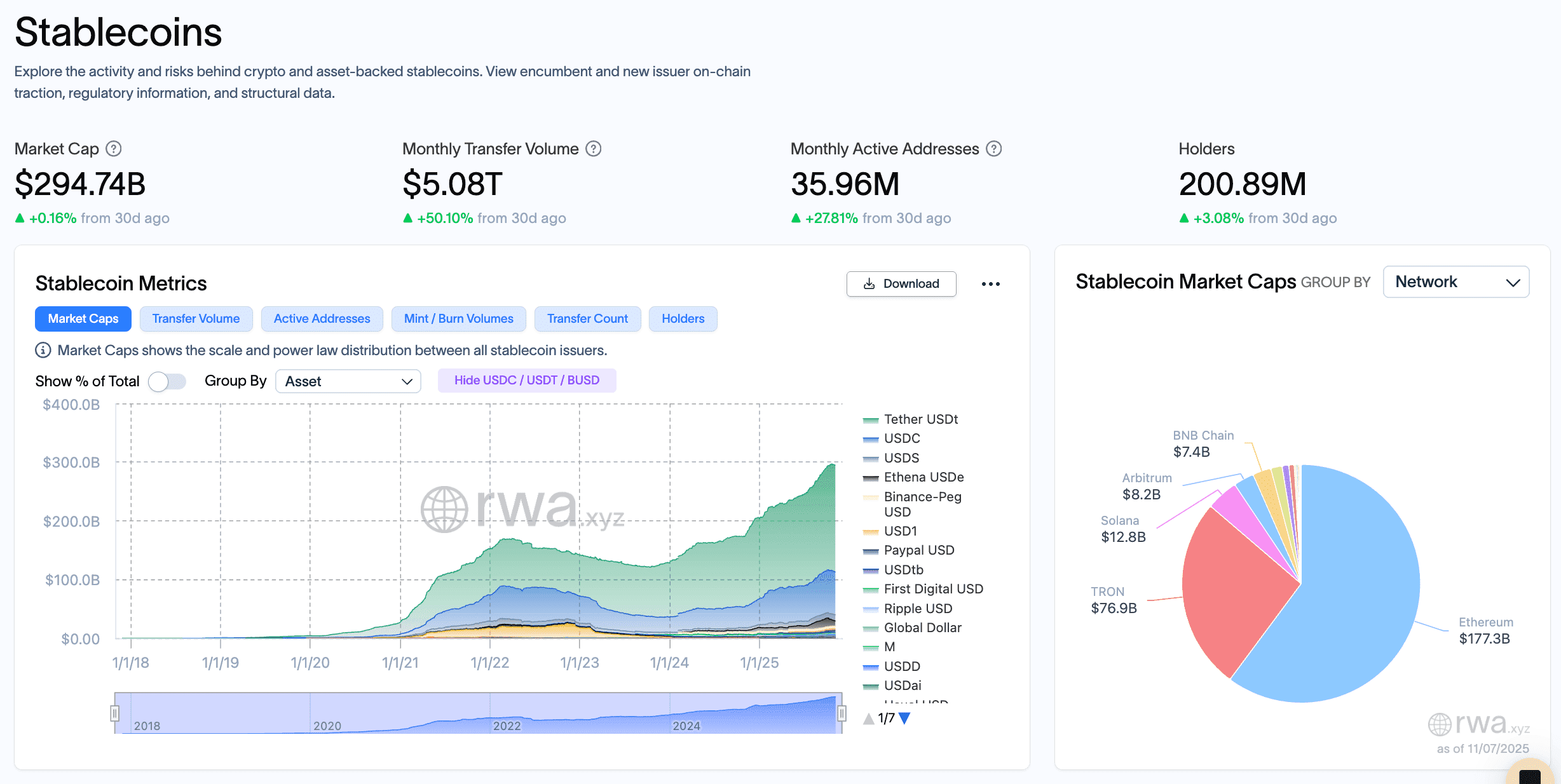 В секторе 531 561 уникальный держатель (+11,66% за 30 дней) и 245 эмитентов (+13 за месяц), среди которых BlackRock, Tether и Franklin Templeton. Стейблкоины, играющие ключевую роль в RWA-транзакциях, имеют отдельную рыночную капитализацию $294,74 млрд.