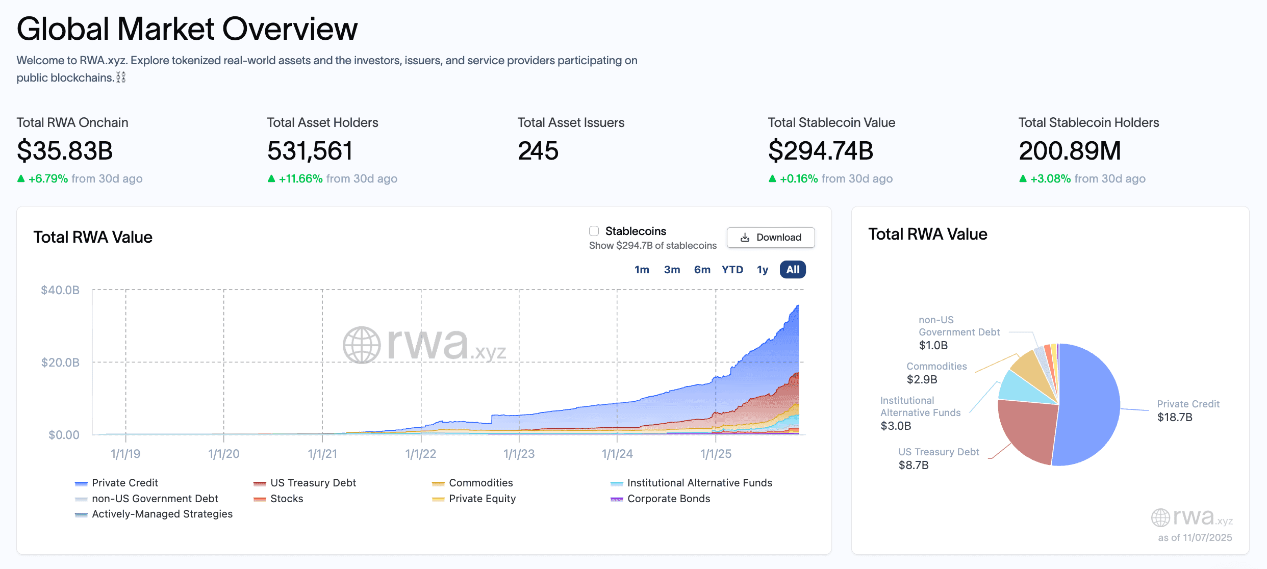 Согласно данным RWA.xyz на 6 ноября 2025 года совокупная стоимость токенизированных активов (за исключением стейблкоинов) составила $35,83 млрд, что на 6,79% выше, чем месяцем ранее.