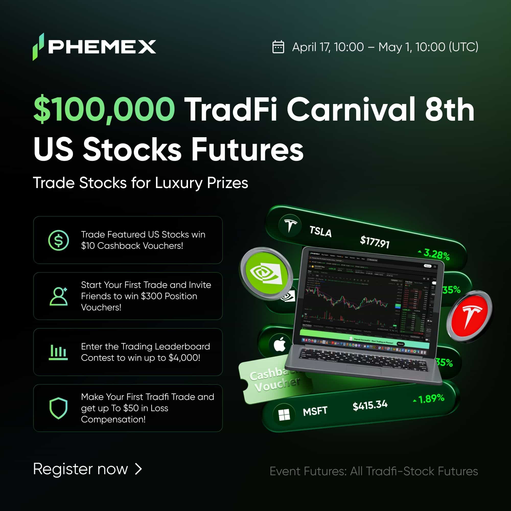 TradFi Carnival возвращается — и в этот раз масштаб события ещё больше. Phemex официально запускает восьмую серию своего флагманского TradFi Carnival, которая пройдет с 17 апреля по 1 мая 2026 года (UTC). Призовой фонд составляет $100 000 и включает ценные призы. Участие открыто как для опытных трейдеров деривативов, так и для тех, кто только начинает знакомство с фьючерсами на акции США. Все операции доступны на одной криптоплатформе.