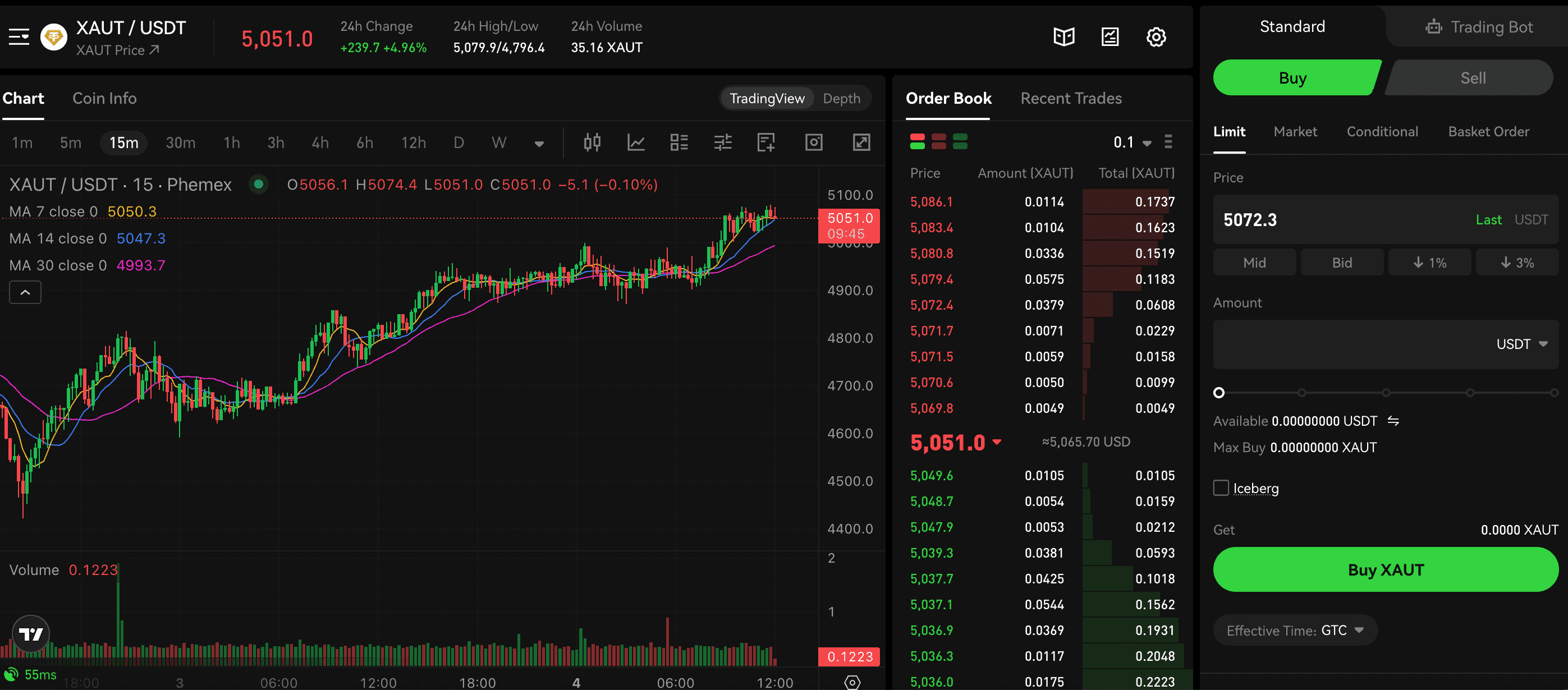 C: Evet. Phemex, fiziksel altın fiyatını takip eden ve günün her saati işlem yapılabilen XAUT (Tether Gold) sunar. Böylece fiyat hareketlerine anında tepki verebilirsiniz.